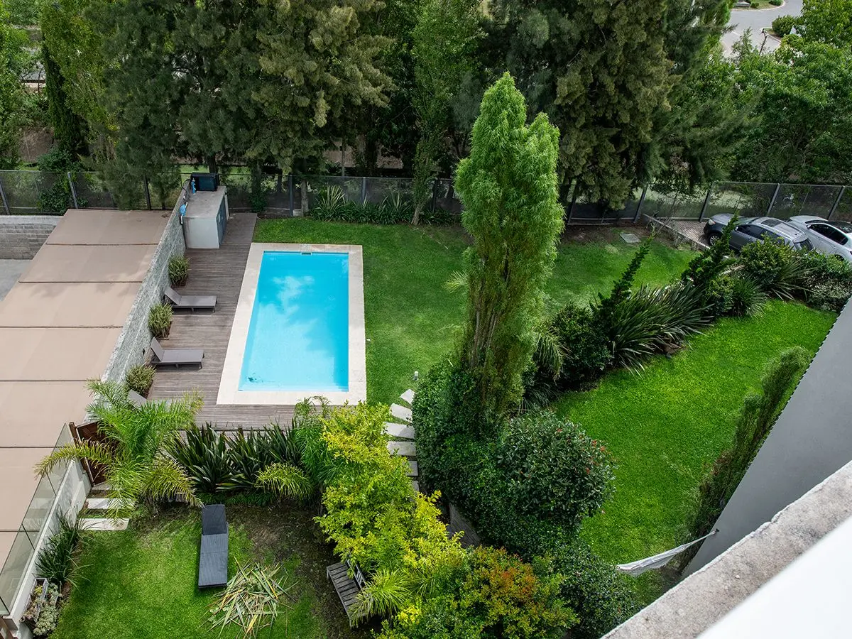 Hall despojador, luminoso living comedor con amplios ventanales y salida a terraza con parrillero, estar con comedor diario, escritorio, baño social, amplia cocina con buen espacio de almacenamiento, anafe, campana y lavadero. 4 dormitorios, 2 en suite y otros 2 baños completos. Terraza con parrillero de 166m² de uso exclusivo en azotea. Garaje techado para 3 autos, uno individual y otros 2 consecutivos, uno detrás de otro. 2 boxes.