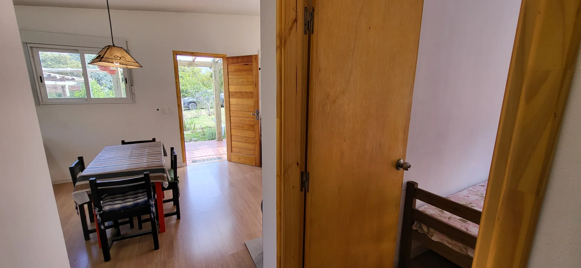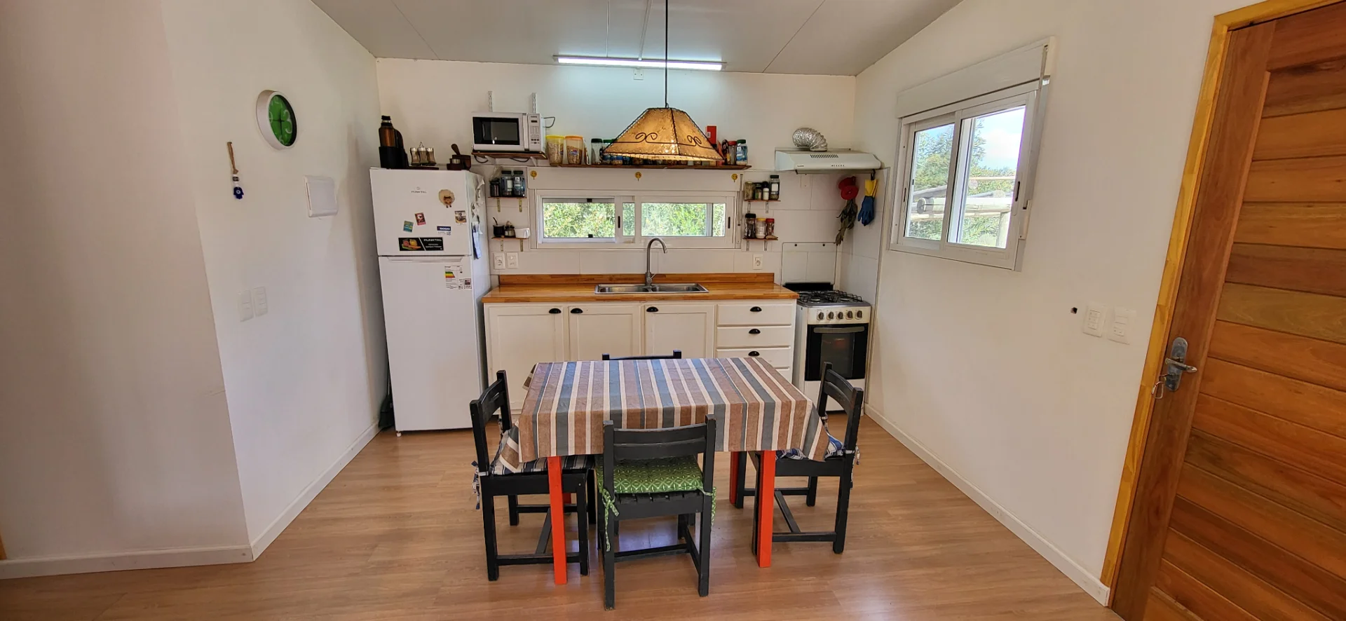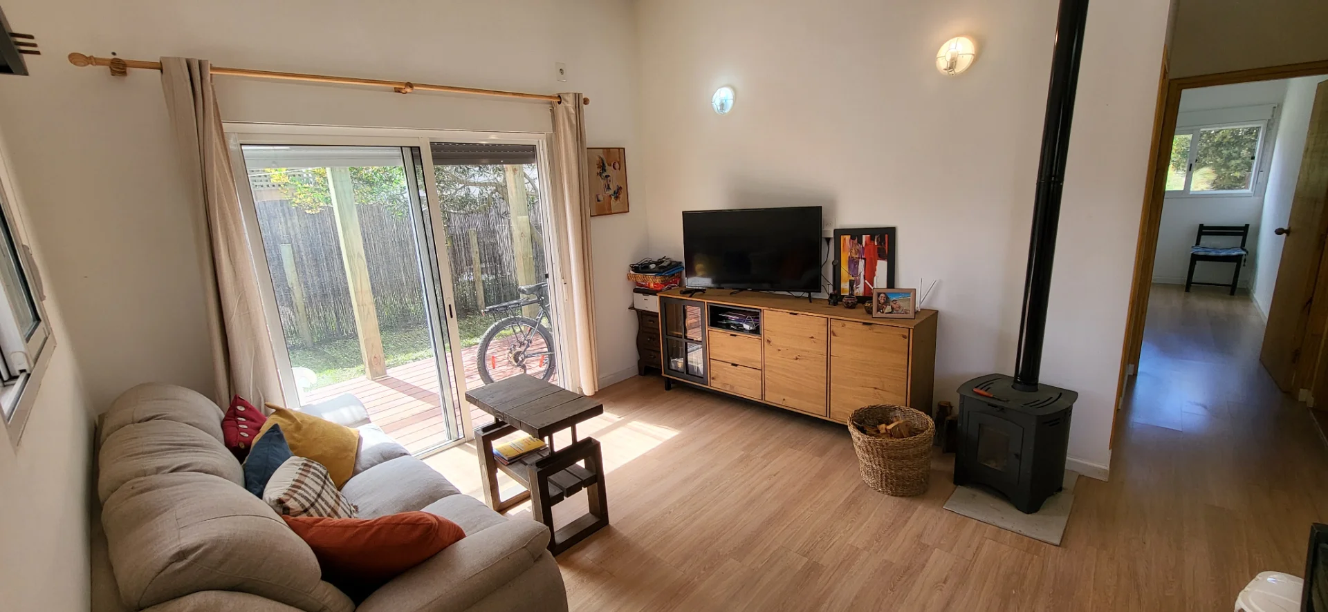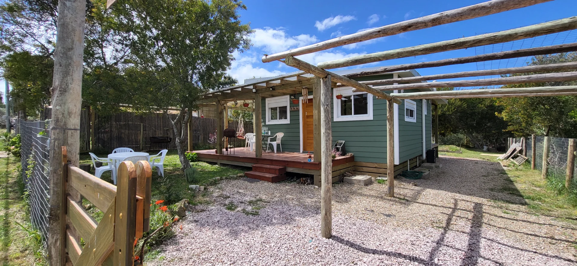 Sus comodidades son living con hogar a leña, cocina-comedor, dos dormitorios y un baño social completo. Tanto al frente como sobre su lateral, tiene un sólido y amplio deck techado.