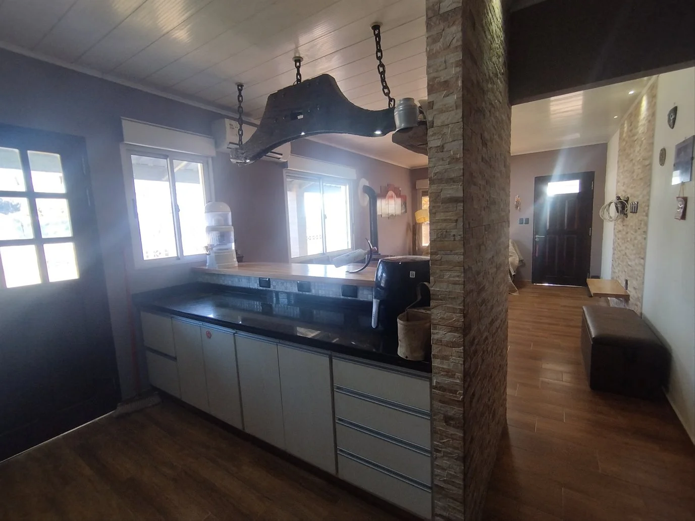El amplio living con calefactor a leña se integra de forma cálida y moderna con la cocina mediante una barra con luminarias de diseño.