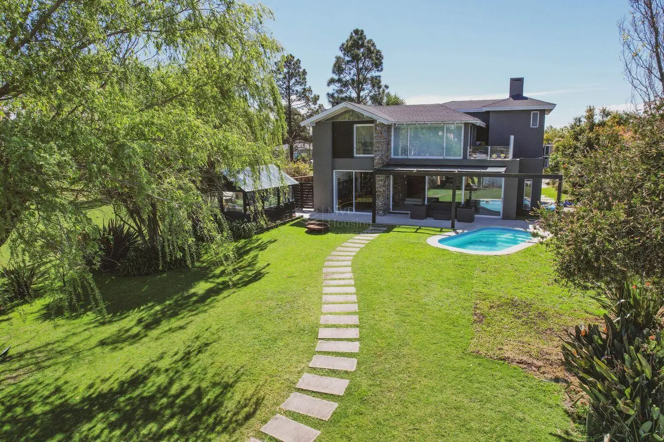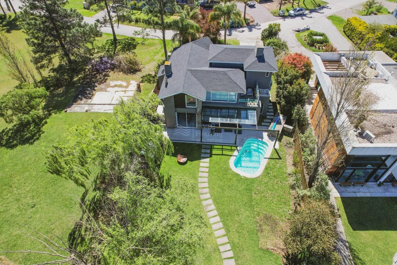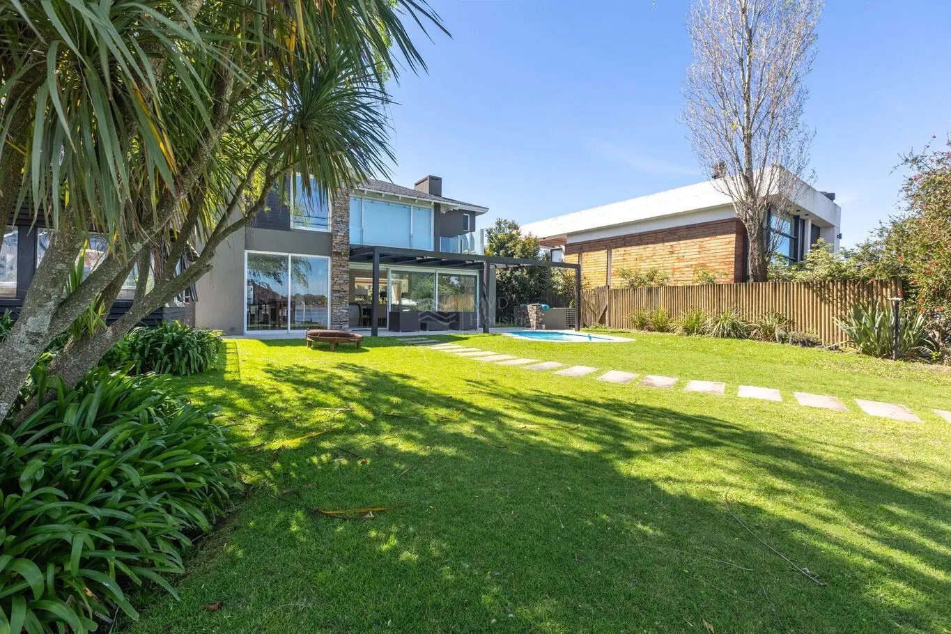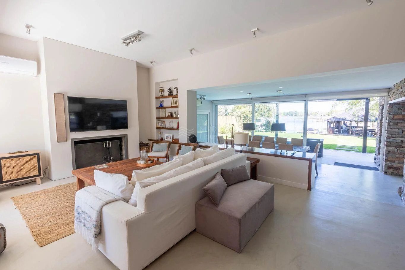 En planta alta se distribuyen los tres dormitorios —dos de ellos en suite—, destacándose la master suite, con vestidor, baño en suite con jacuzzi y una excepcional vista al río desde su terraza de uso exclusivo. La casa cuenta con cuatro baños en total, cochera con instalación para vehículo eléctrico y espacio para cinco autos dentro del predio.