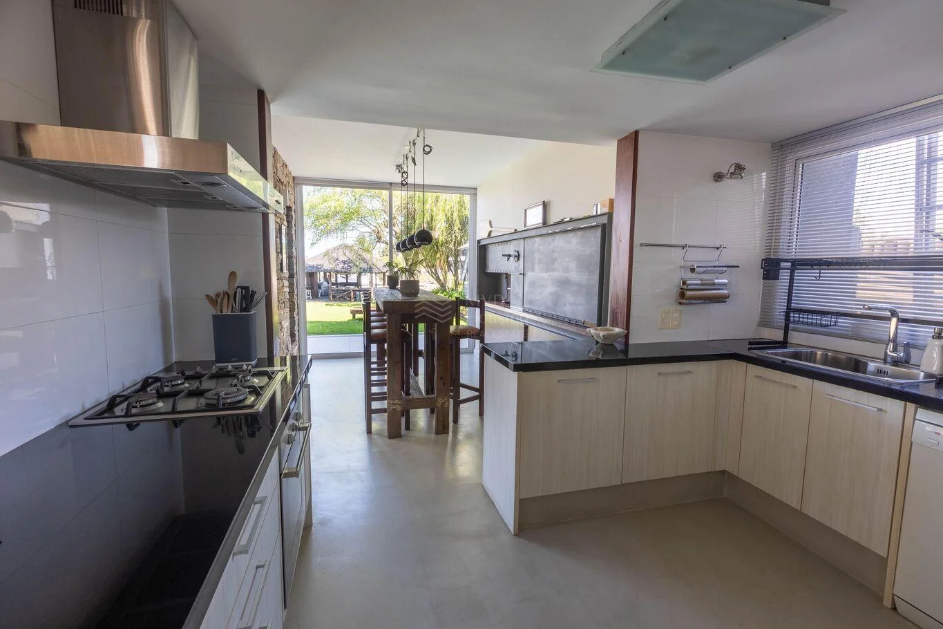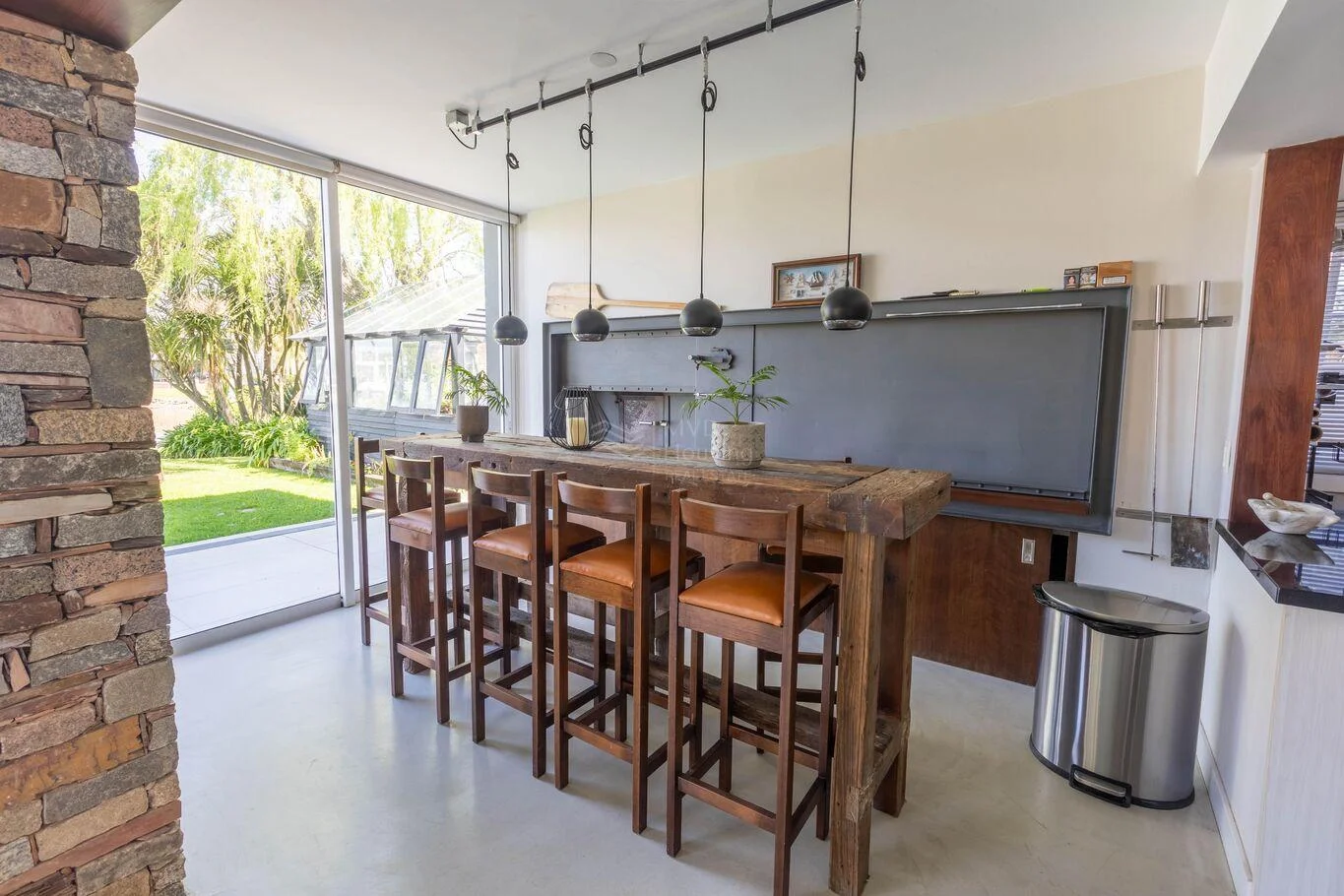 En planta baja ofrece un cálido estar con estufa de leña, cocina integrada equipada con parrillero y horno de pan, y un amplio comedor con ventanales que se abren al jardín y al río, amplio lavadero y baño social.
