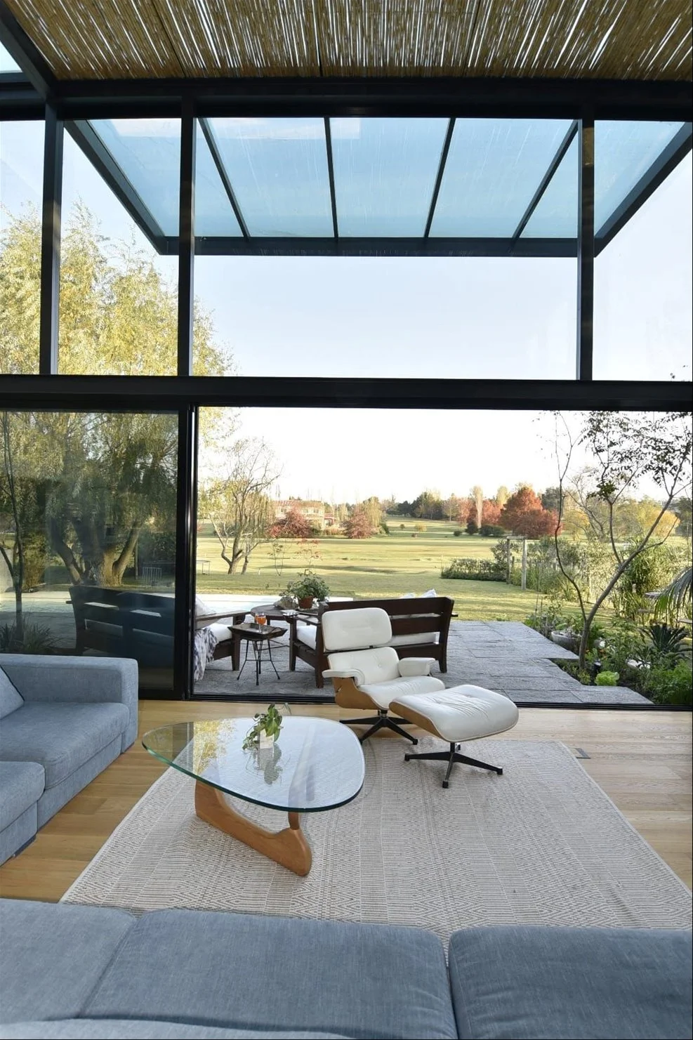 Living comedor con estufa a leña, techos en doble altura y aberturas plegables de piso a techo unificando el espacio interior con el exterior aterrazado con piedra.