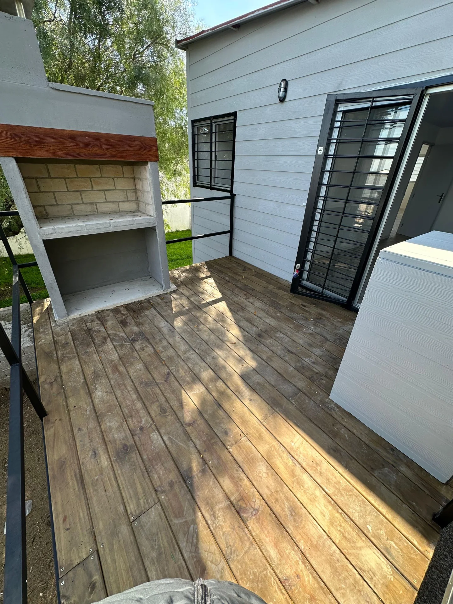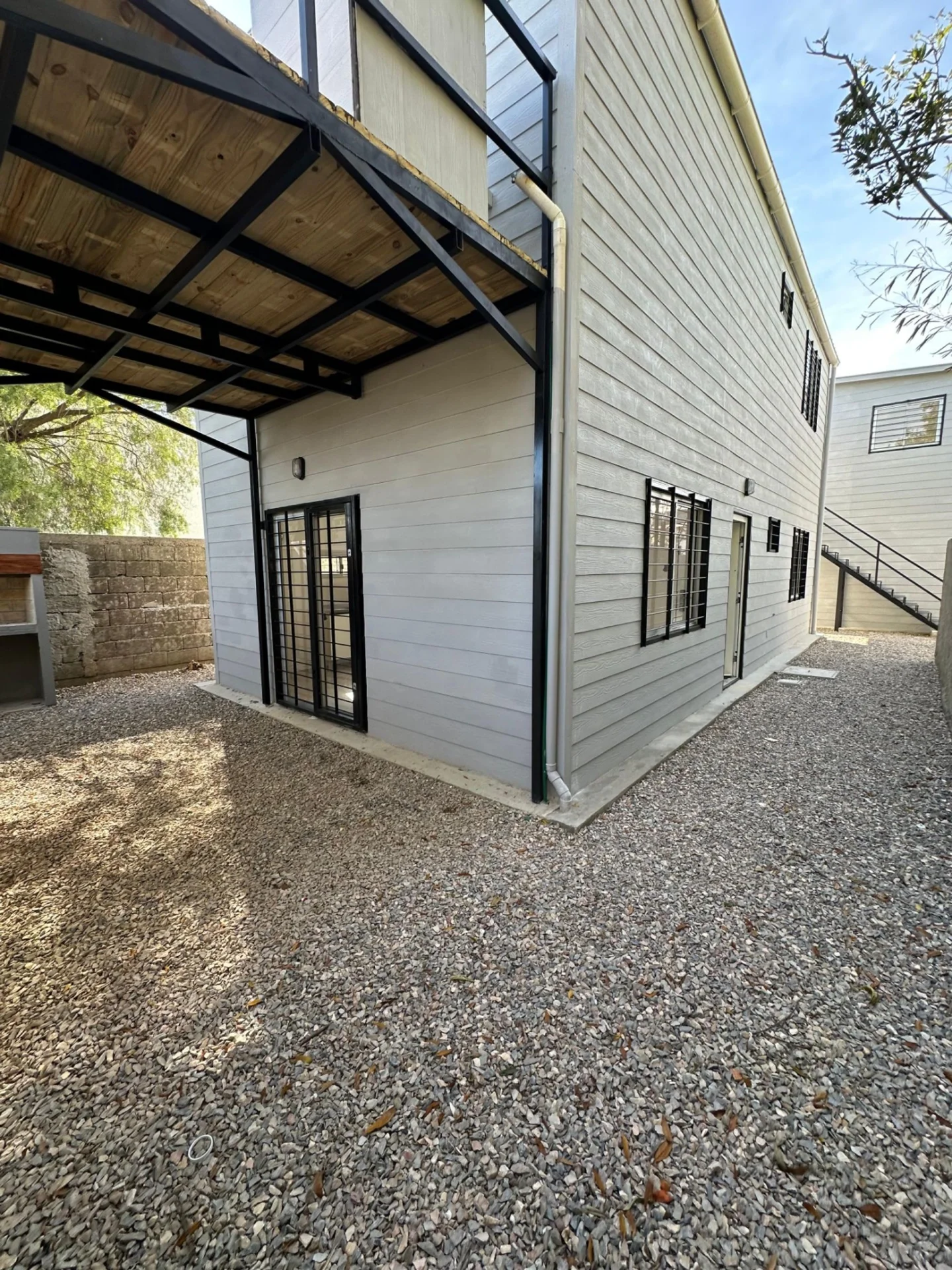 Construcción en steel framing, con buenas terminaciones. Al ingresar al predio, encontramos la cochera techada y un pasillo lateral abierto que da acceso a la vivienda.