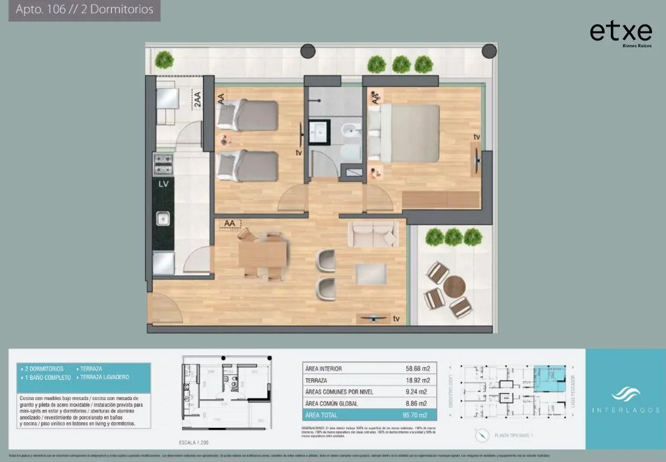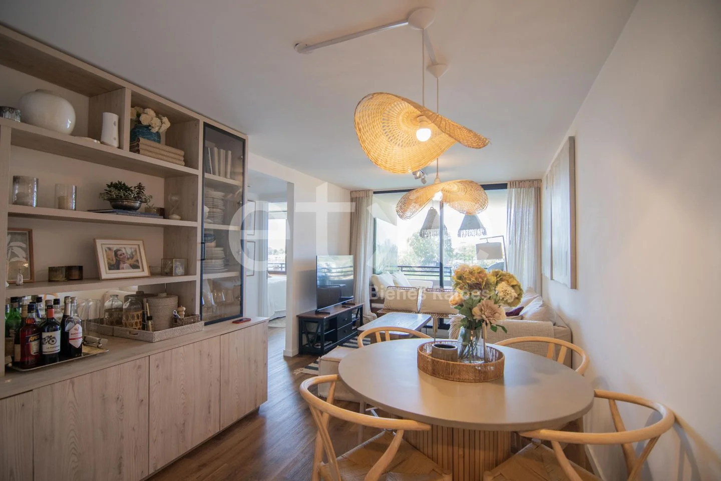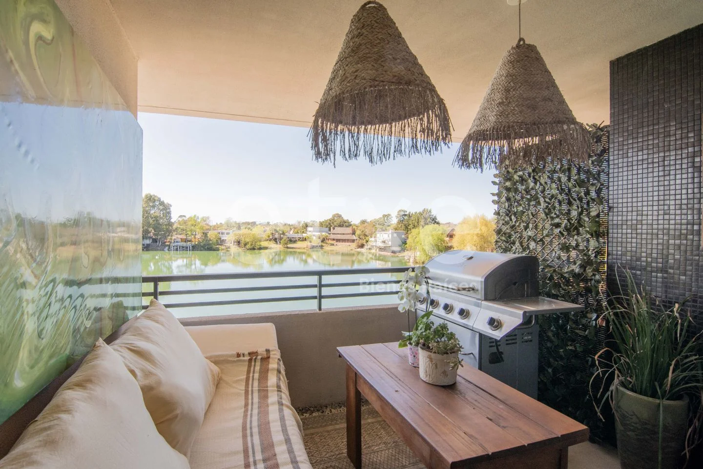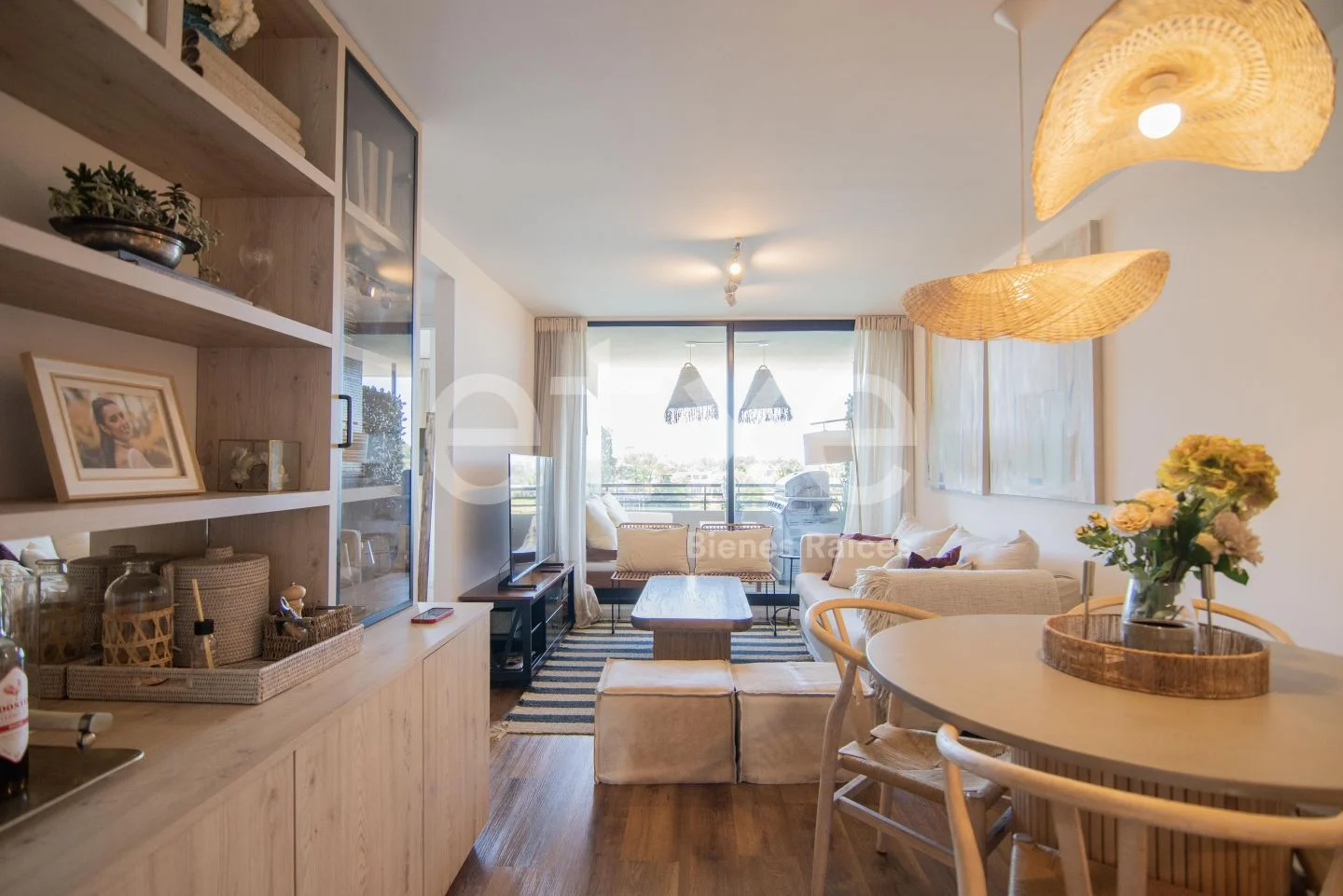 Apartamento con preciosa vista hacia el lago. Cuenta con living comedor y salida a amplia terraza. Cocina definida con terraza de servicio. Dos dormitorios, con con salida a balcón y un baño completo.