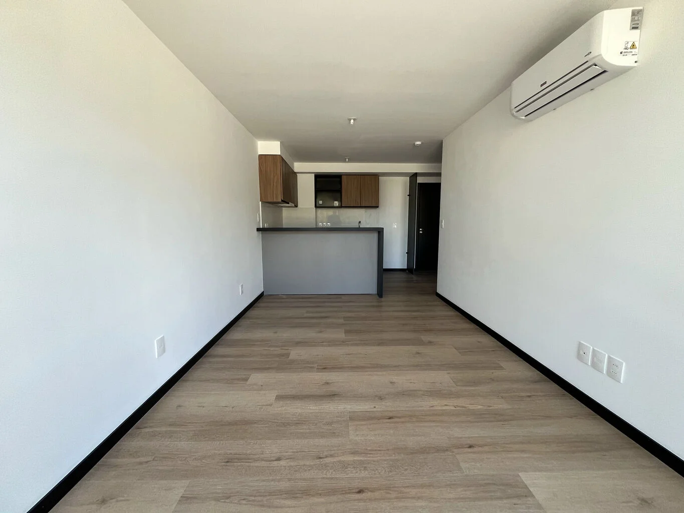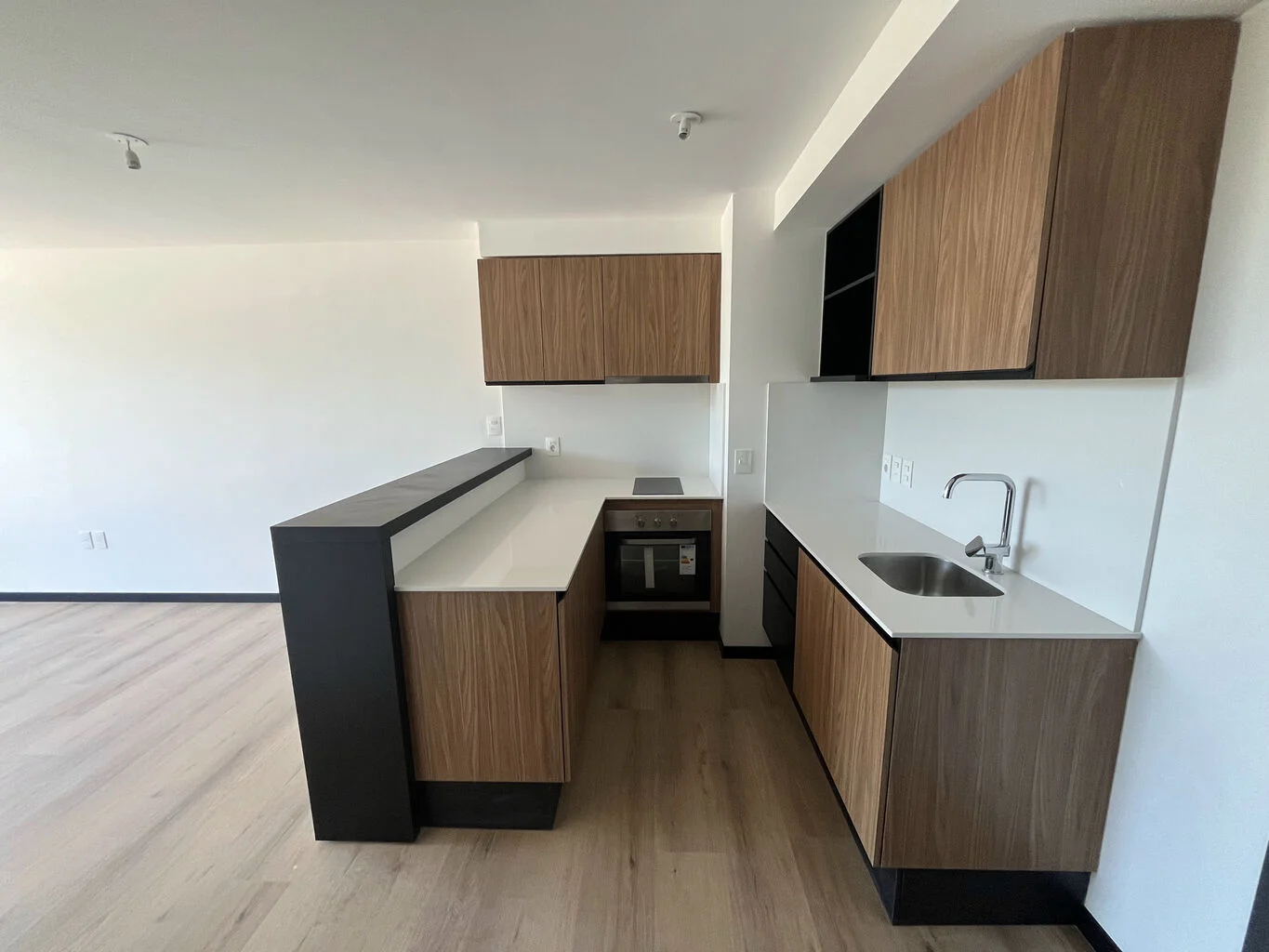 Cocina integrada, con muebles bajo y sobre mesada, equipada con horno empotrado, anafe y campana extractora