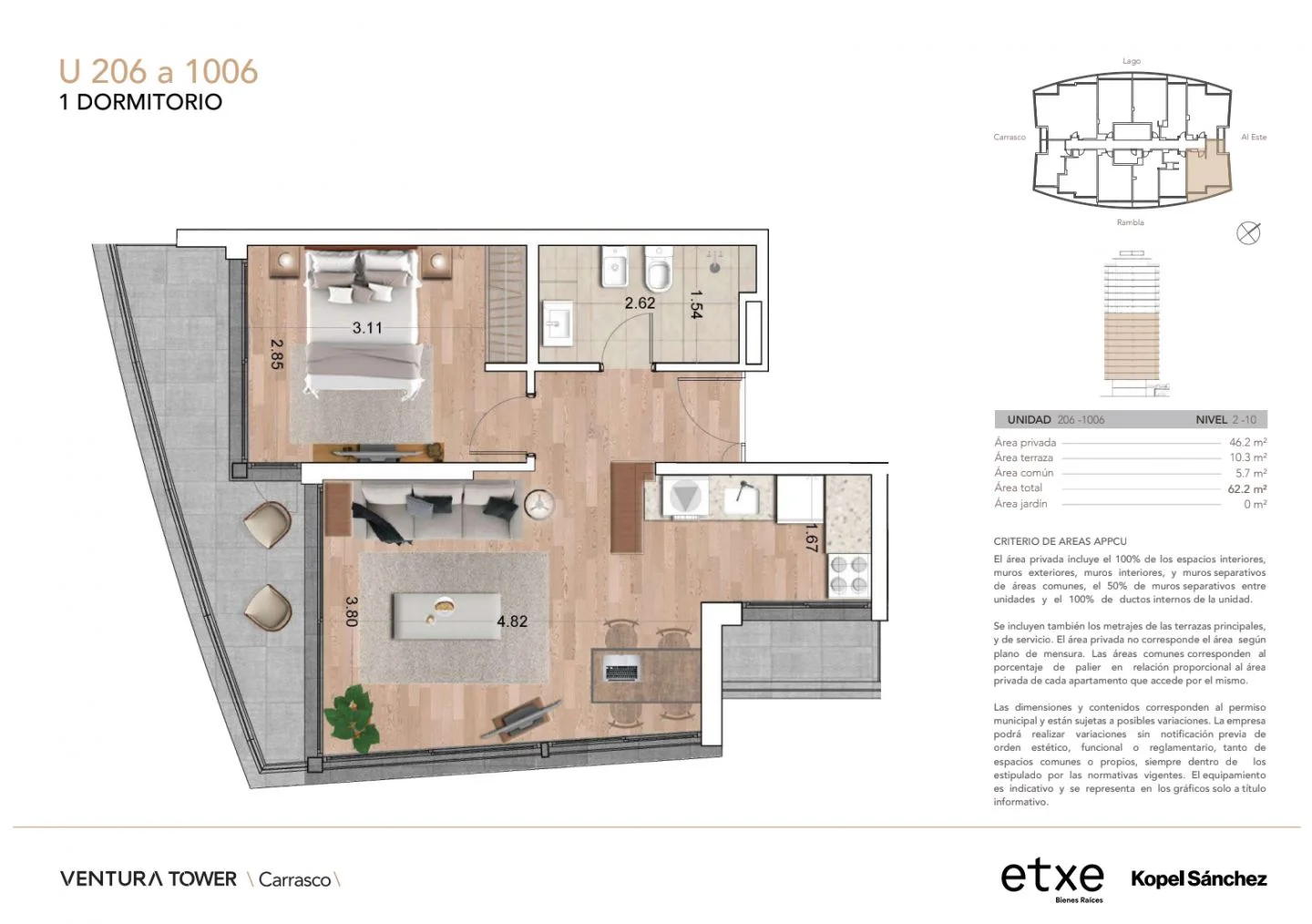 Alquiler de Apartamento 1 DORMITORIO en Ventura Tower Carrasco, Av. de las Americas, Canelones.
