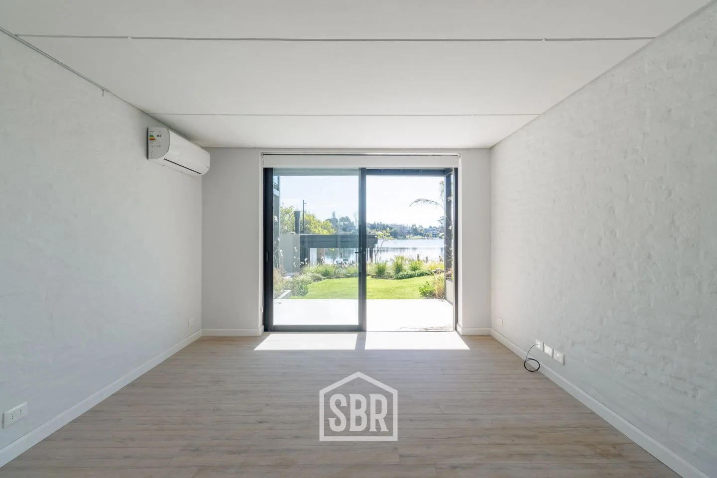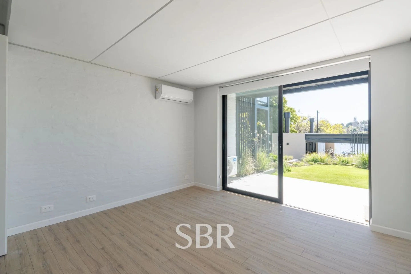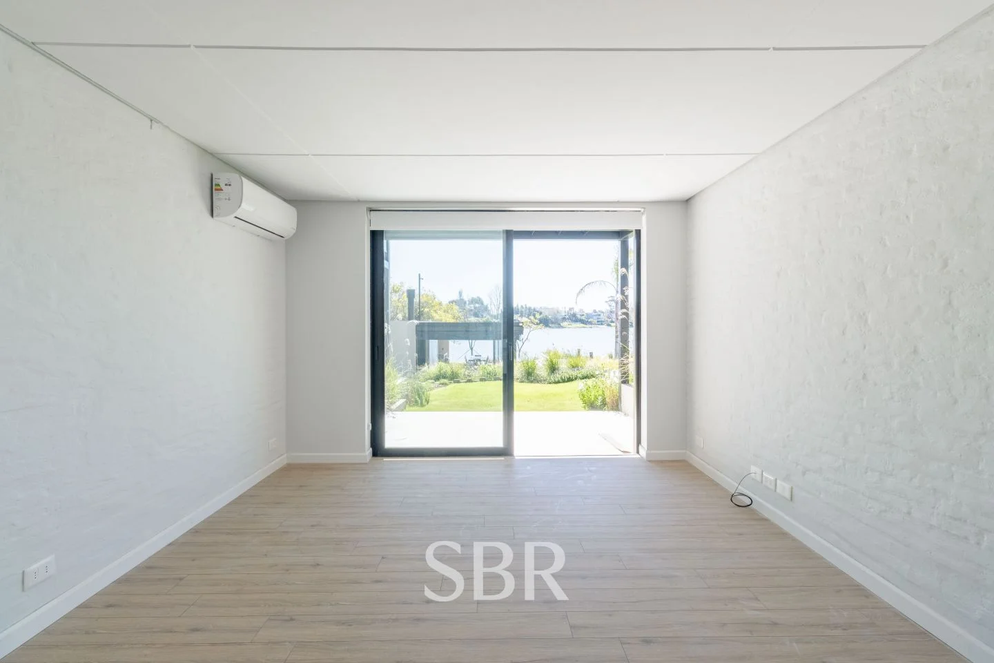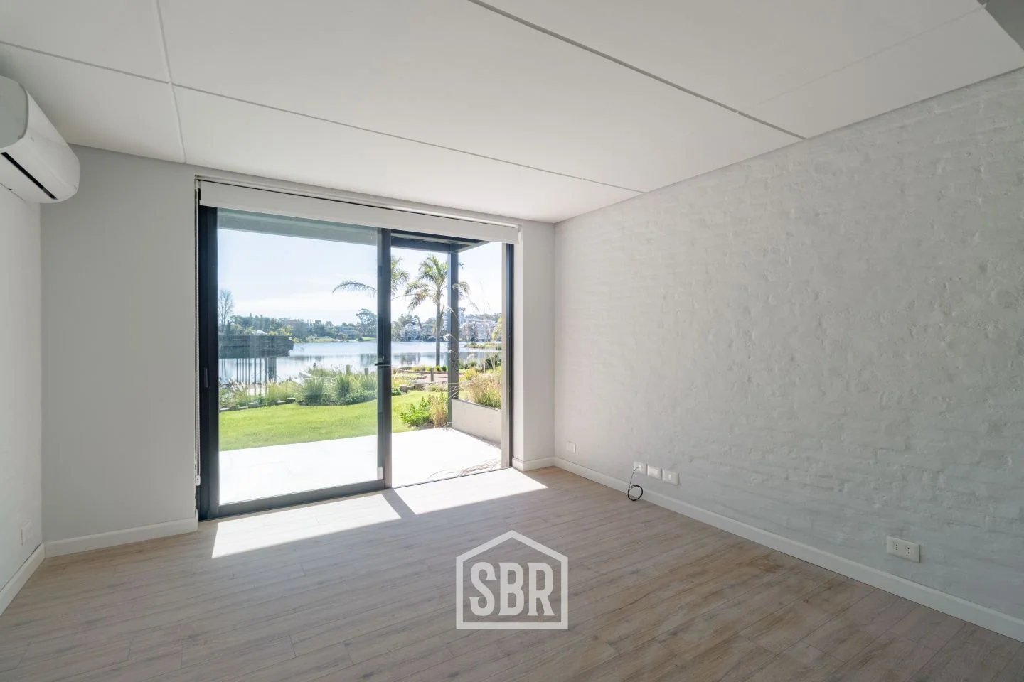 Ambiente principal con placares, ventanales de piso a techo y aire acondicionado.