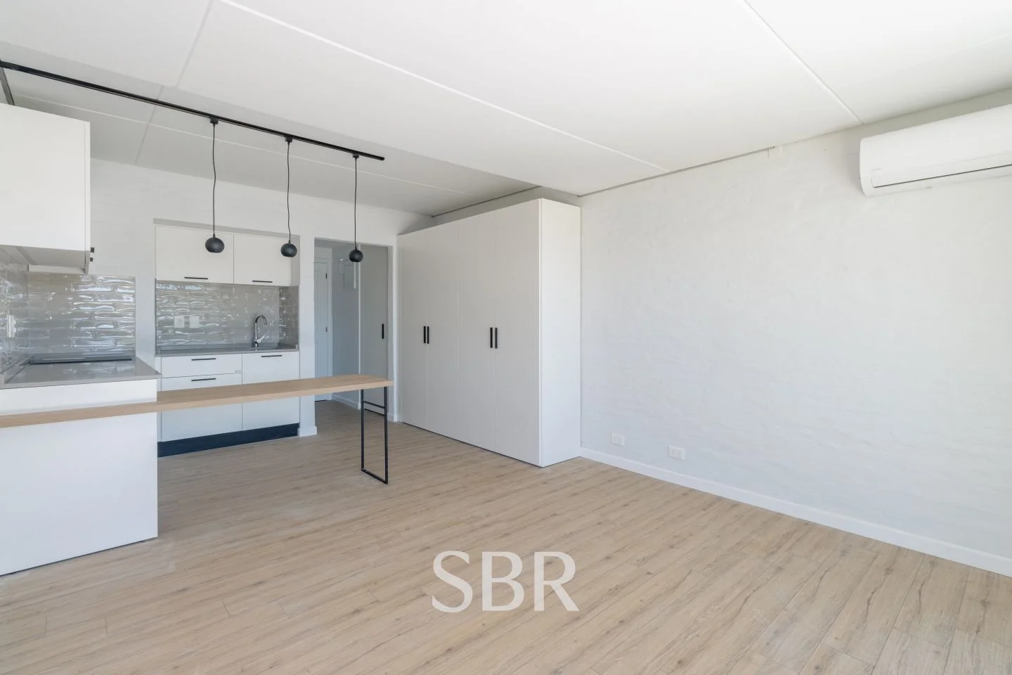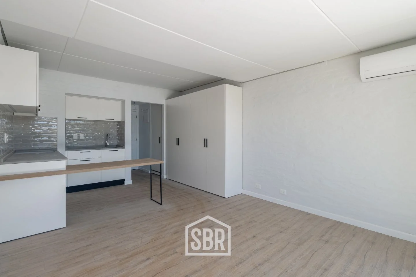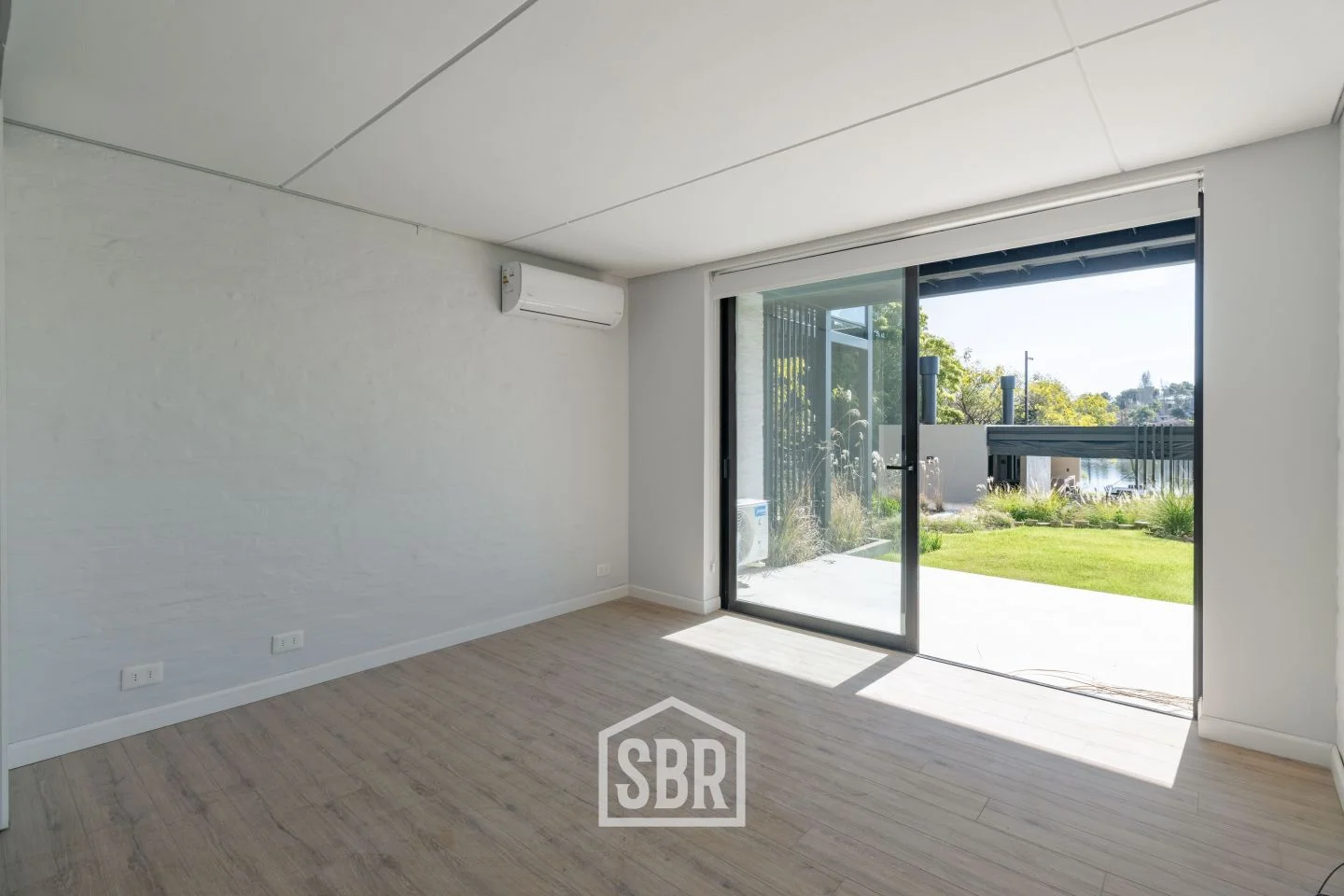 Ambiente principal con placares, ventanales de piso a techo y aire acondicionado.