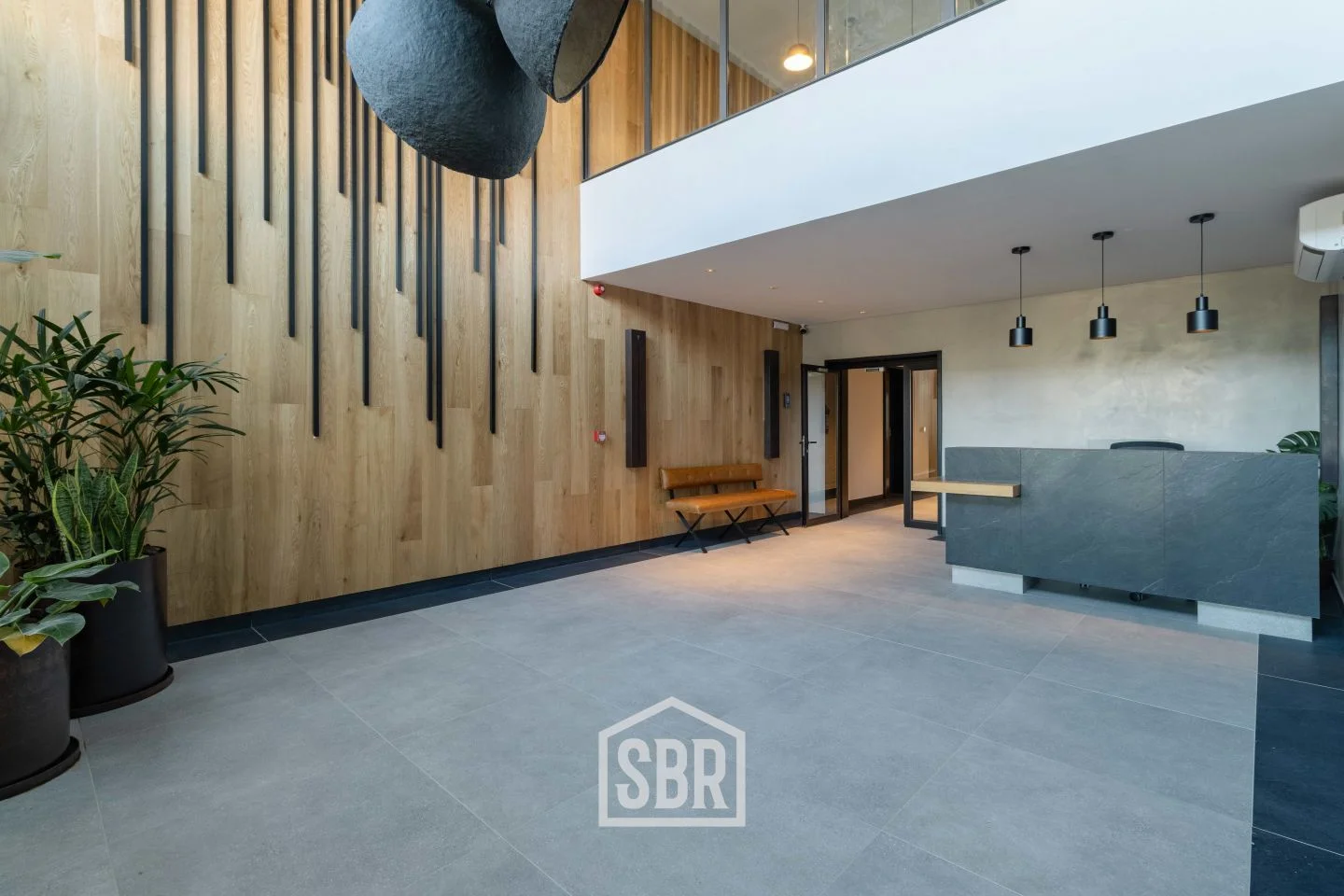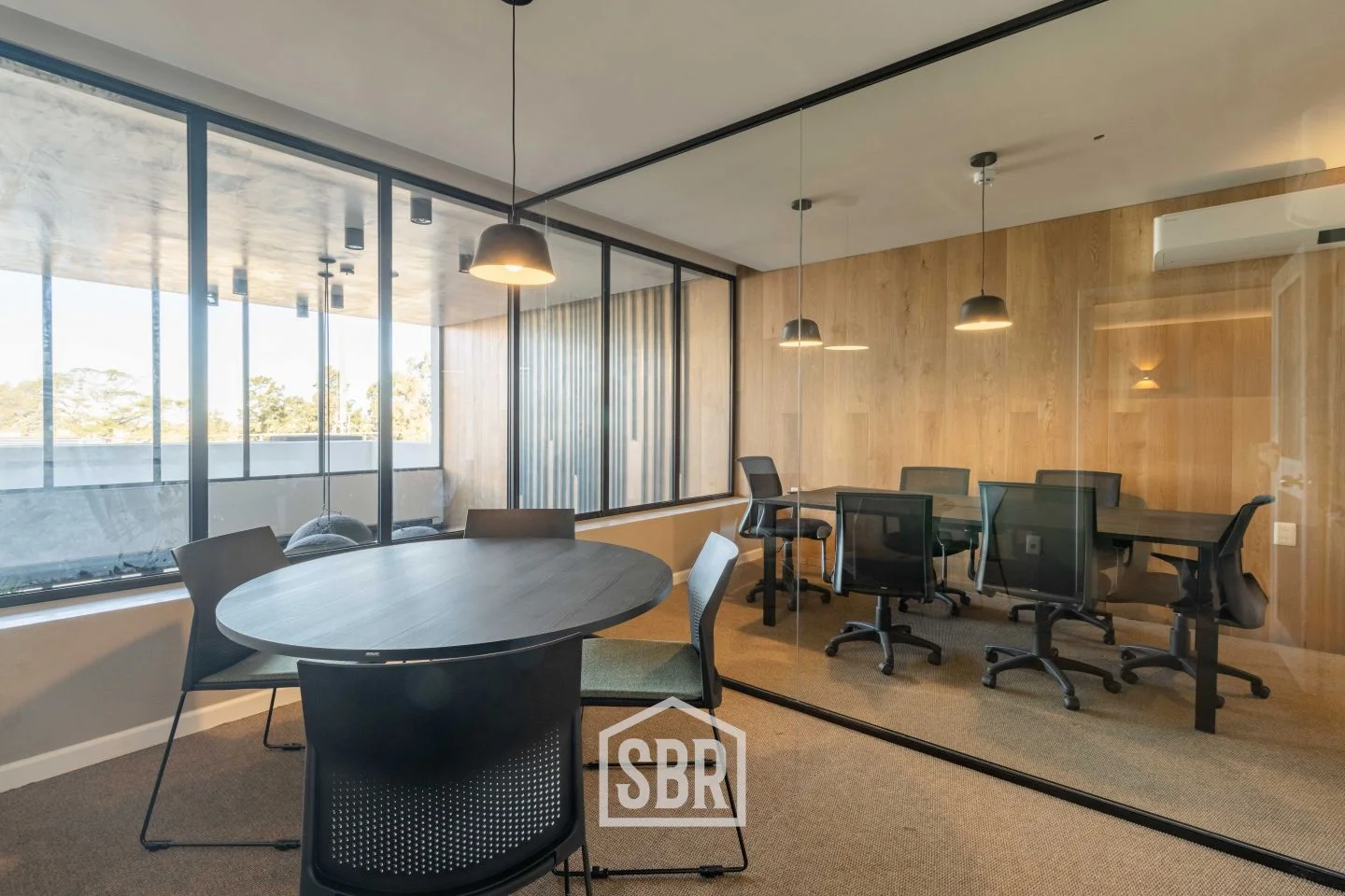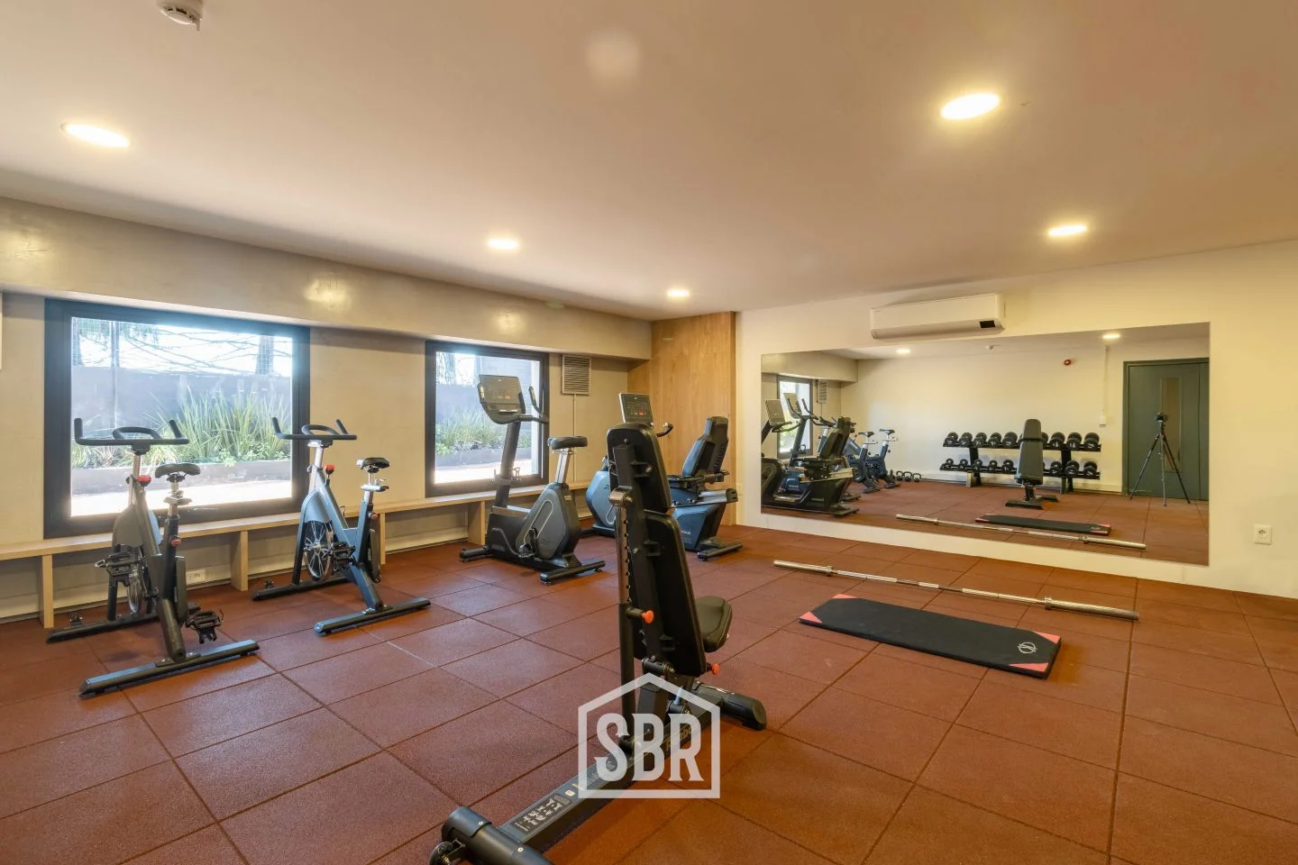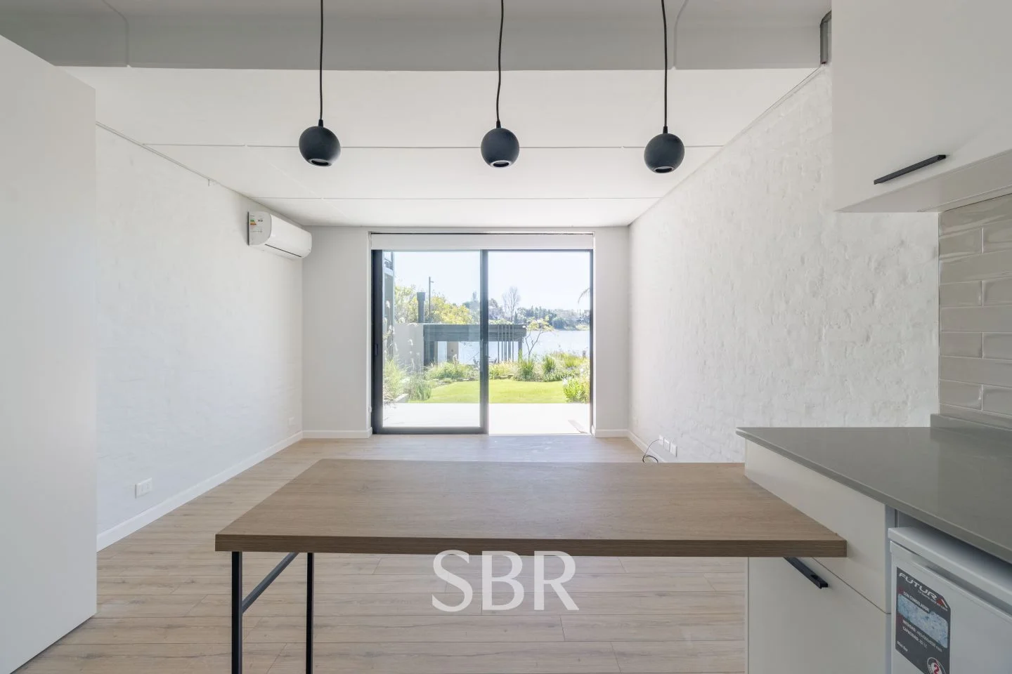 Ambiente principal con placares, ventanales de piso a techo y aire acondicionado.