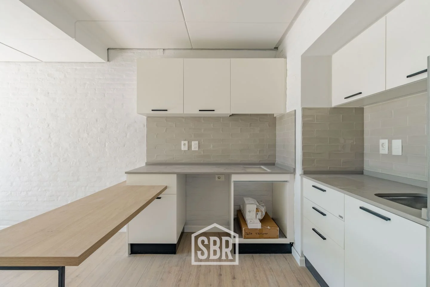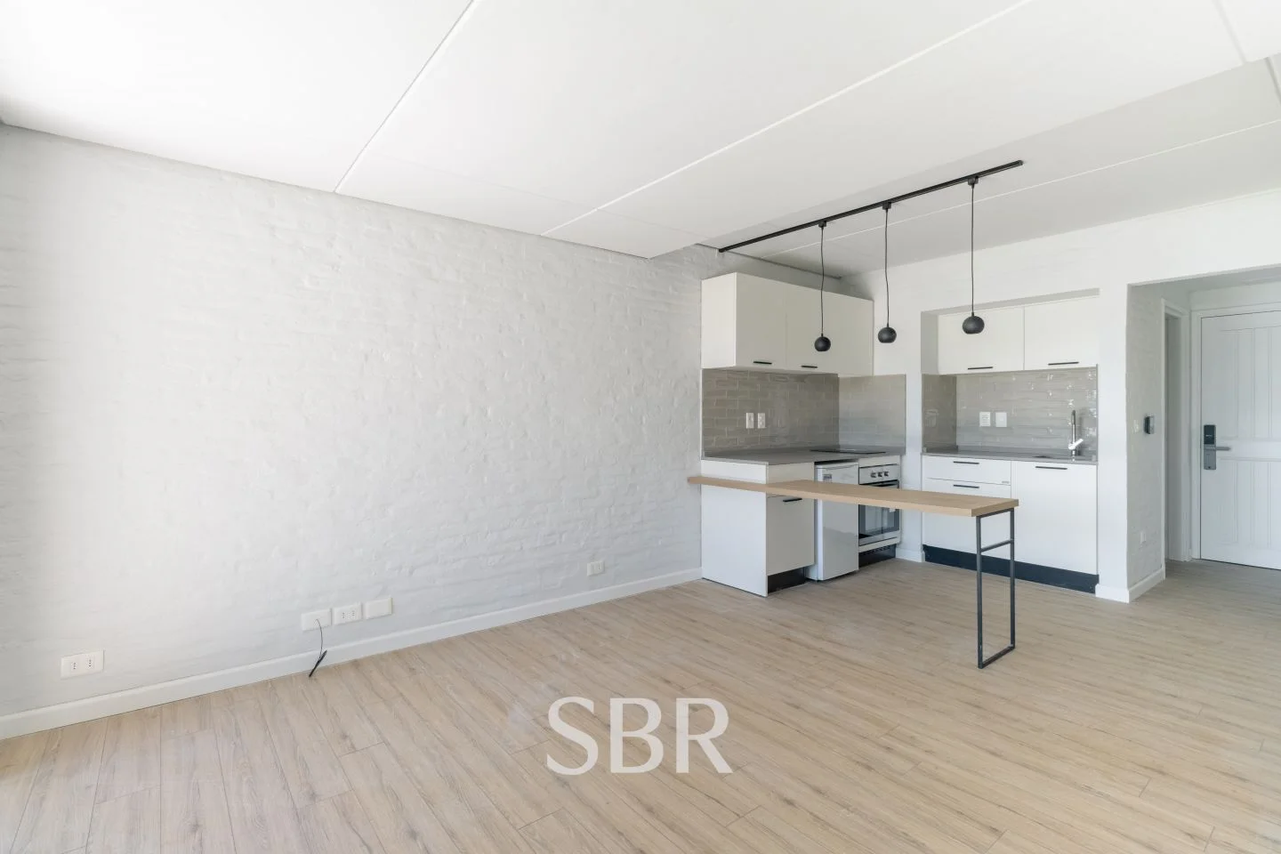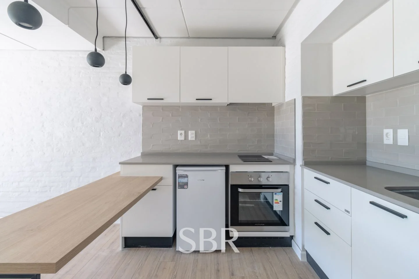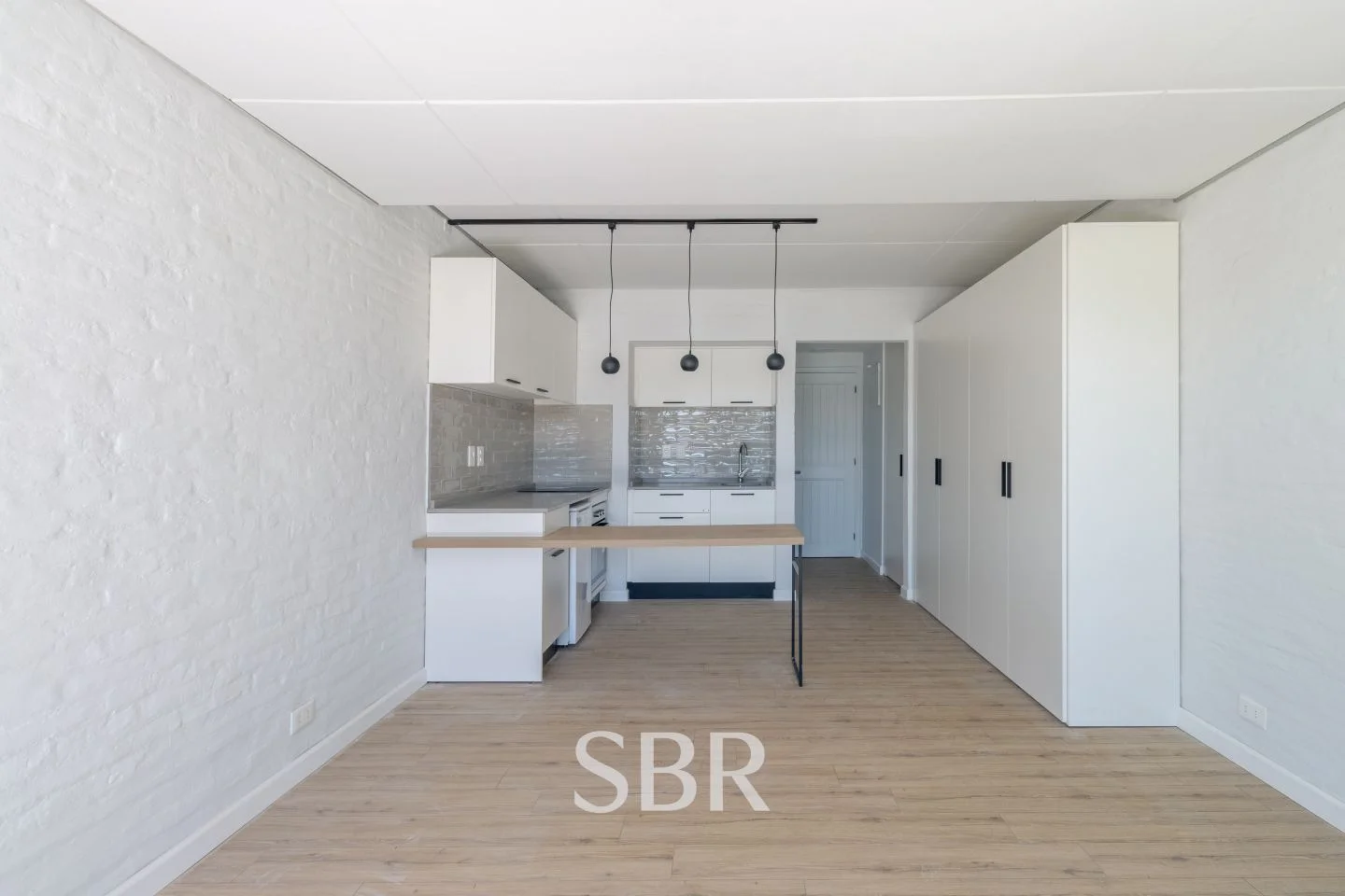 Cocina integrada y equipada, con barra desayunadora y placares sobre y bajo mesada.
