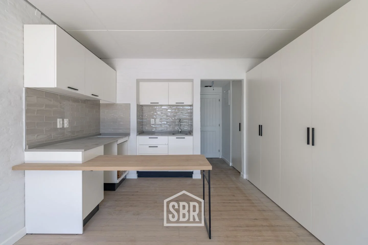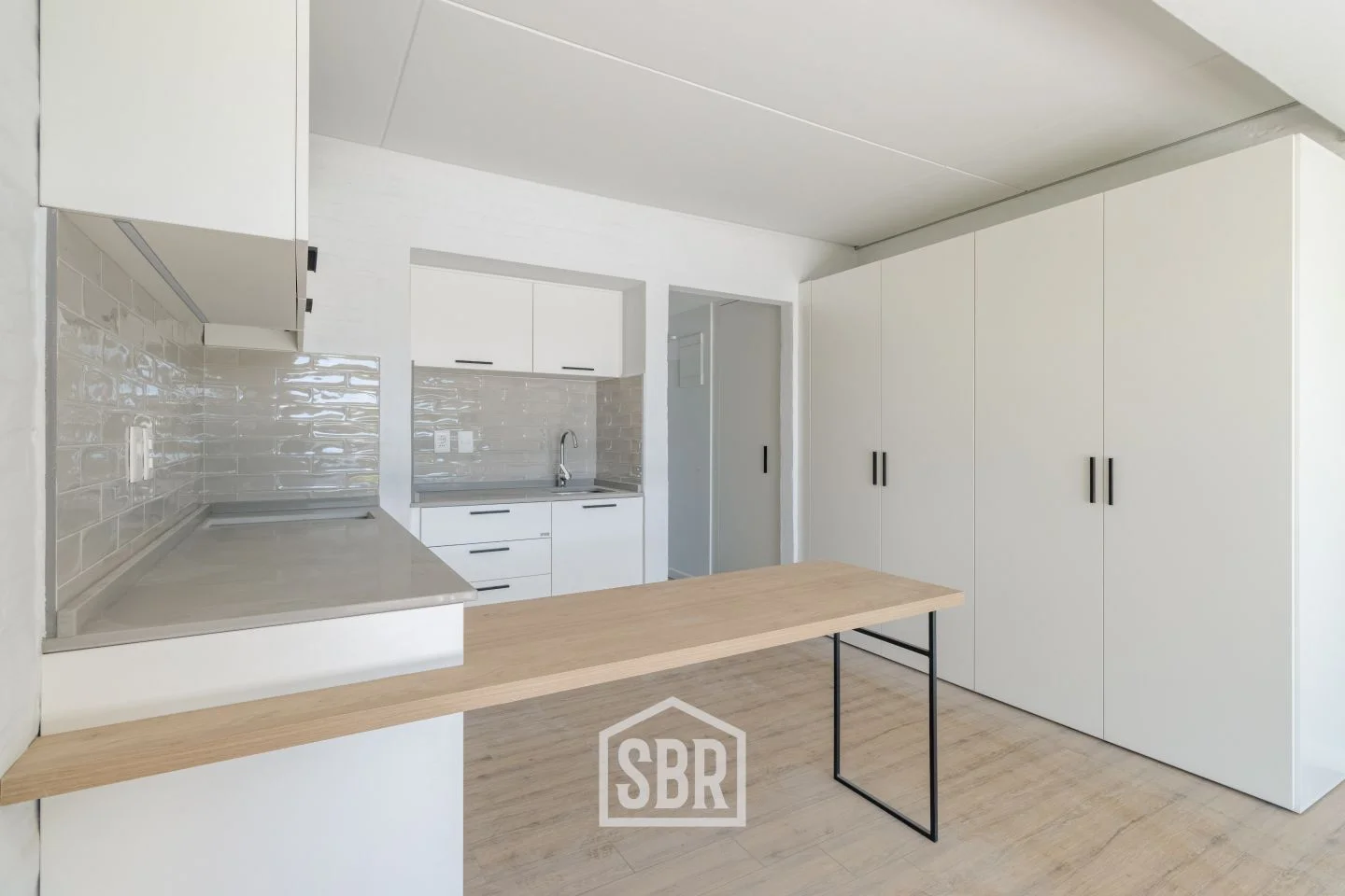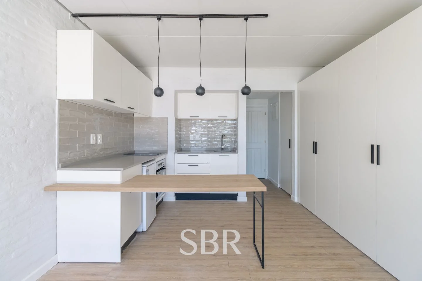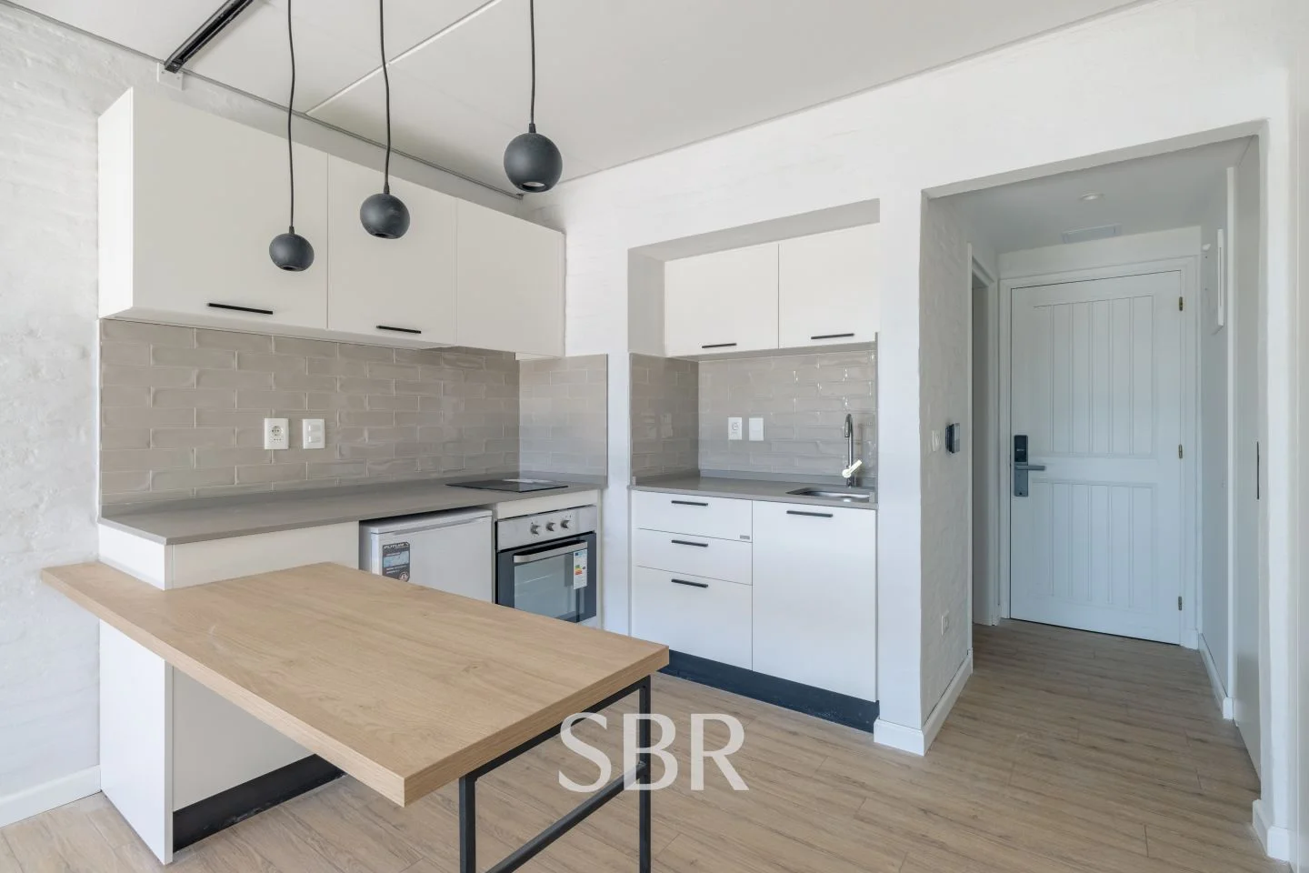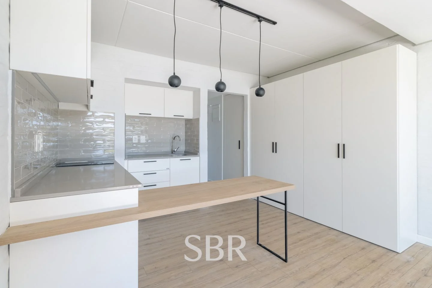 Cocina integrada y equipada, con barra desayunadora y placares sobre y bajo mesada.