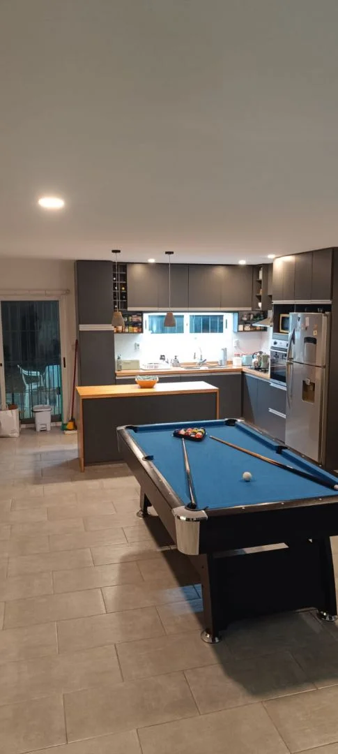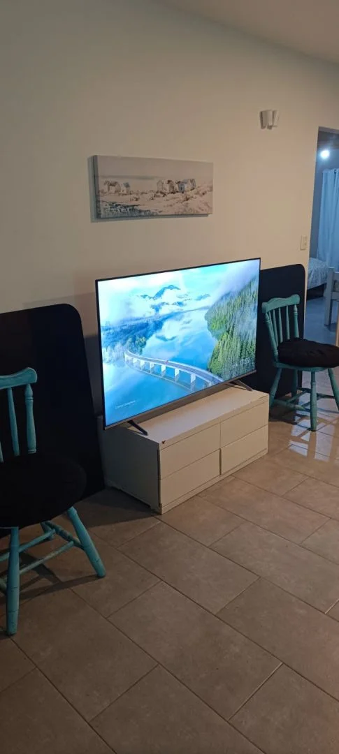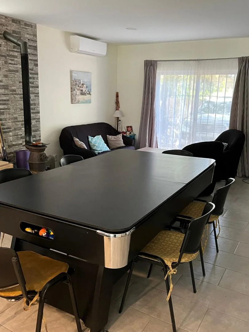 Amplio living-comedor-cocina integrado con aire acondicionado: Living: 1 sillón-cama (para 2 personas), sillón de 2 cuerpos, 2 sillones individuales, mesa ratona, rack con TV Smart con wifi; Comedor: mesa grande con 6 sillas (que se puede adaptar a mesa de pool); Cocina: totalmente equipada con heladera con freezer, microondas, anafe, horno eléctrico, lavarropas, calefón y múltiples utensilios de cocina y juego completo de vajilla para 7 personas.
