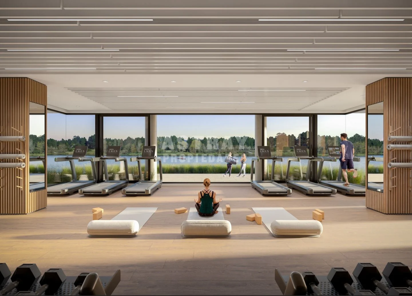 Living comedor con cocina semi integrada y salida a balcón con vista lateral al lago.