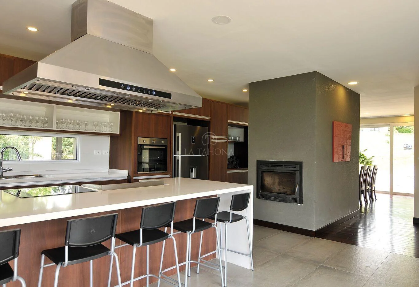 • Cocina con isla central de Silestone con plancha eléctrica integrada, anafe de vitrocerámica y campana de acero inoxidable con otra estufa de alto rendimiento