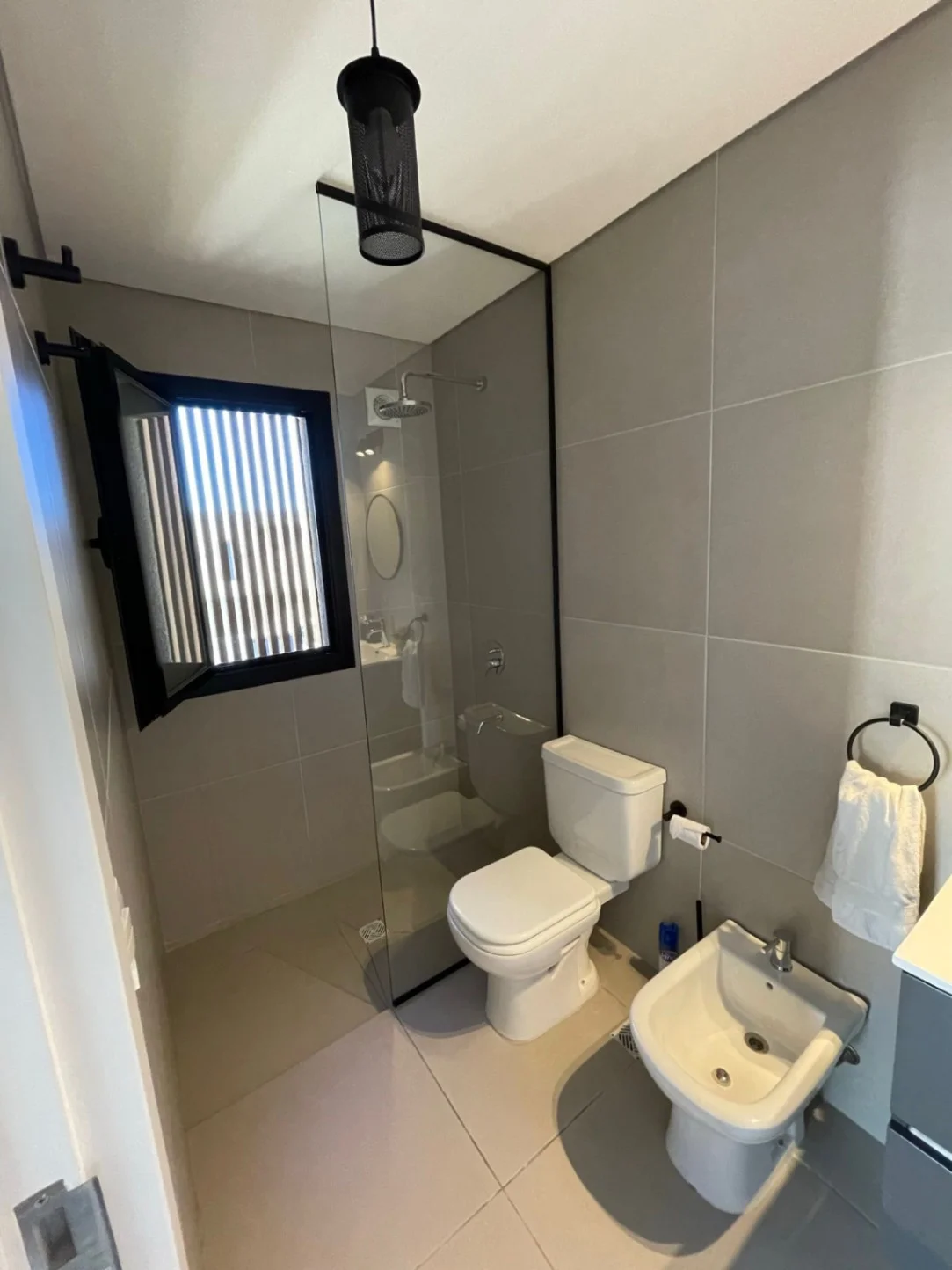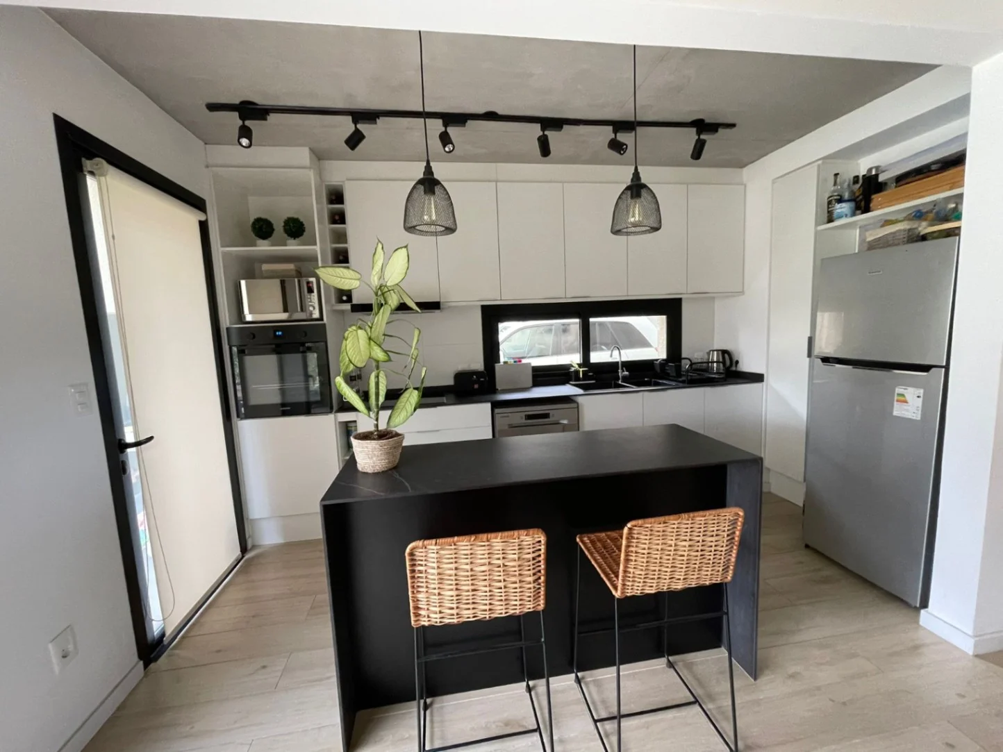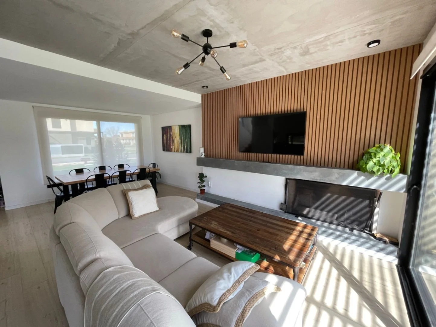 En planta baja, muy luminoso living comedor con estufa a leña, cocina integrada con salida al parrillero y baño completo.