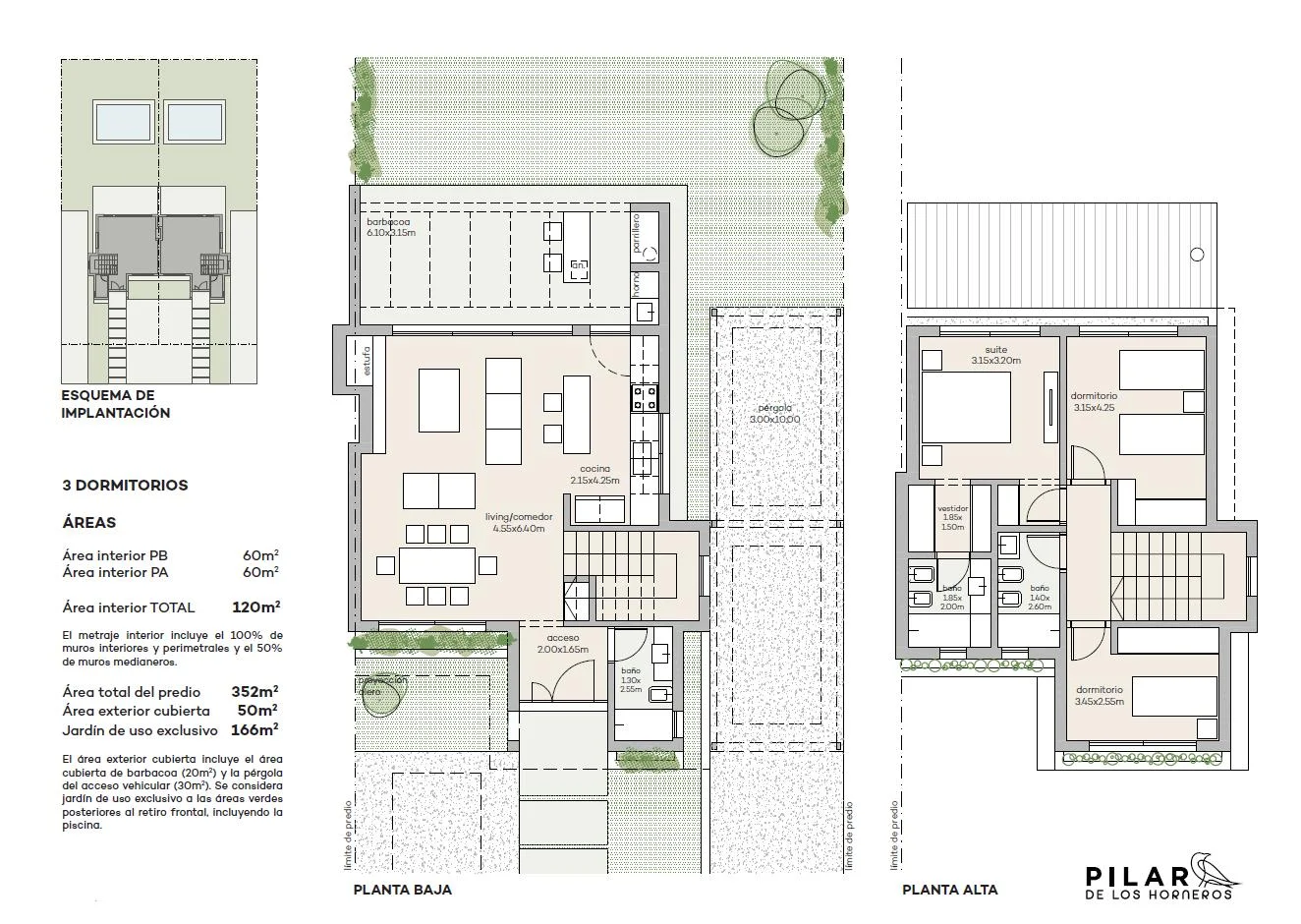 Sólida construcción tradicional, desarrollada en dos niveles, con planta baja 60m², planta alta 60m², exterior cubierta 50m² y jardín de uso exclusivo 166m².