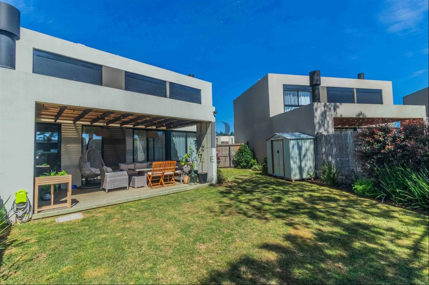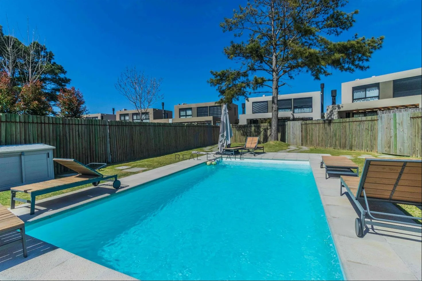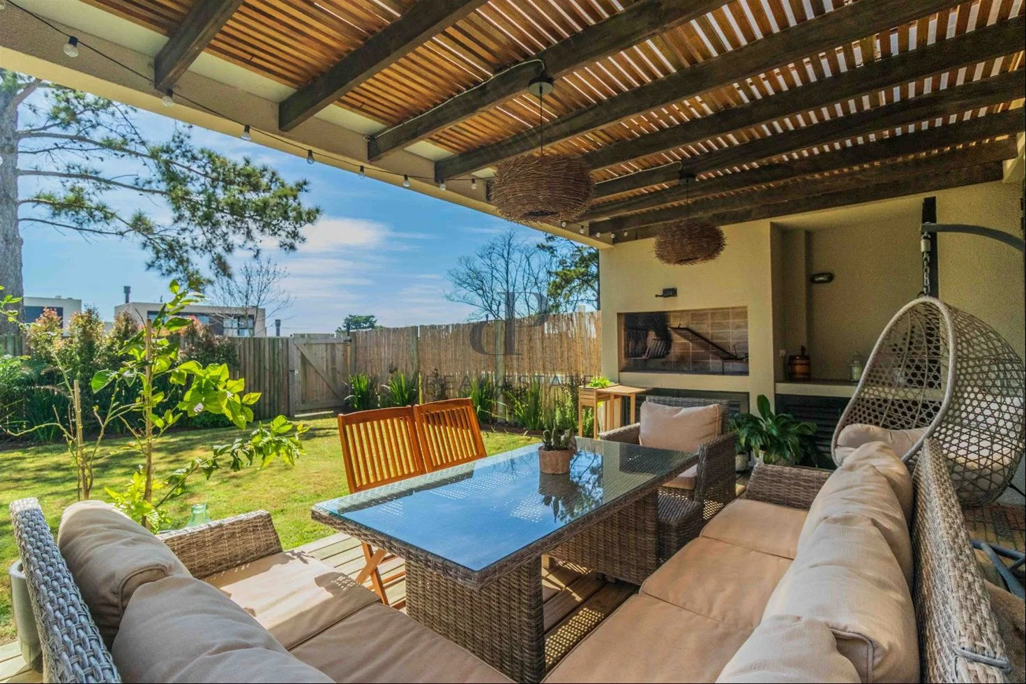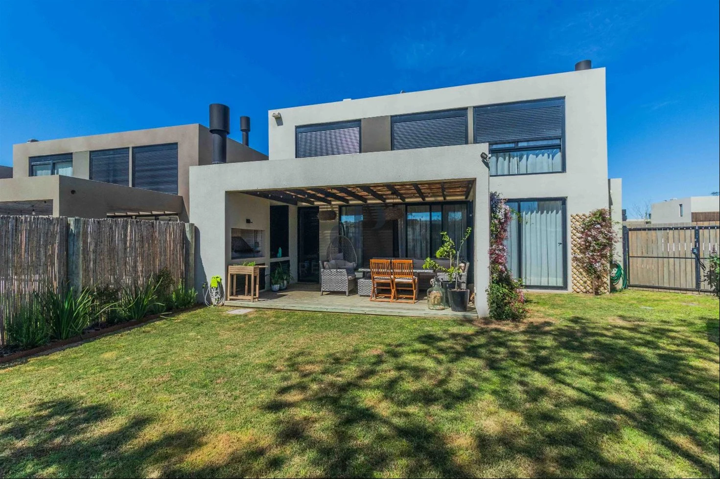 Deck con parrillero. Salida a piscina que comparten 5 casas.