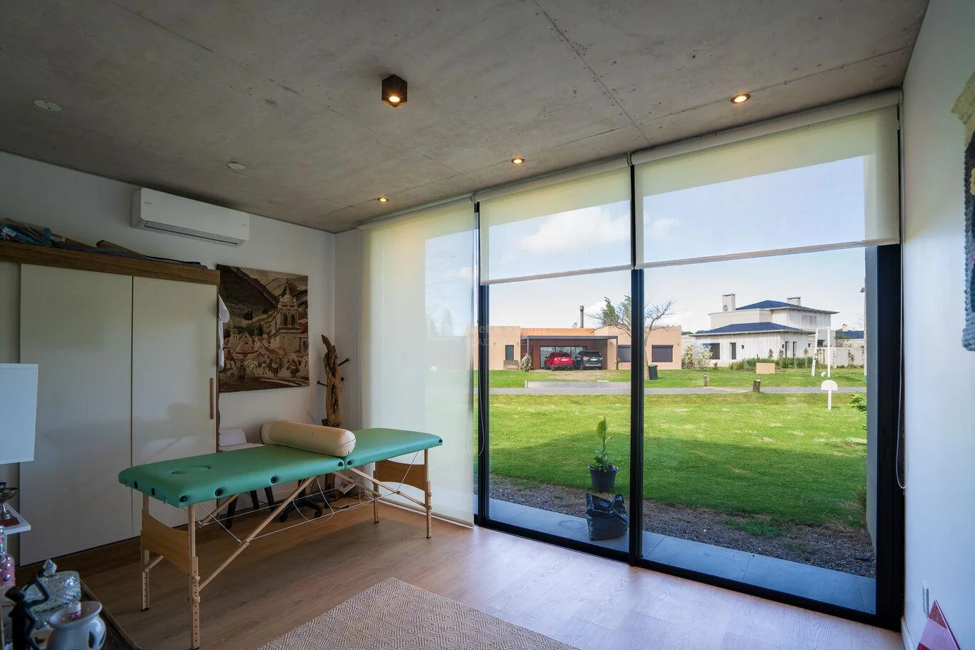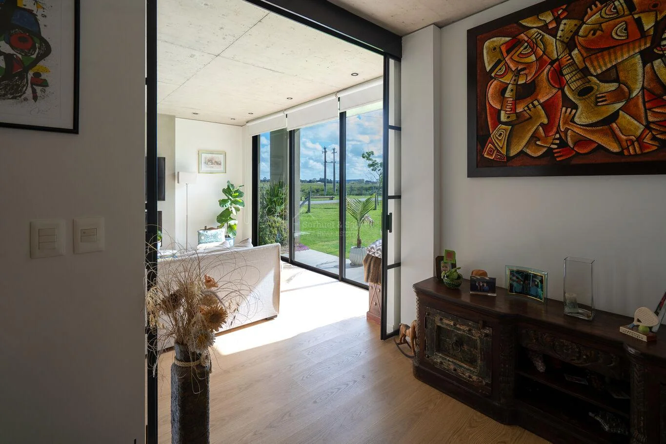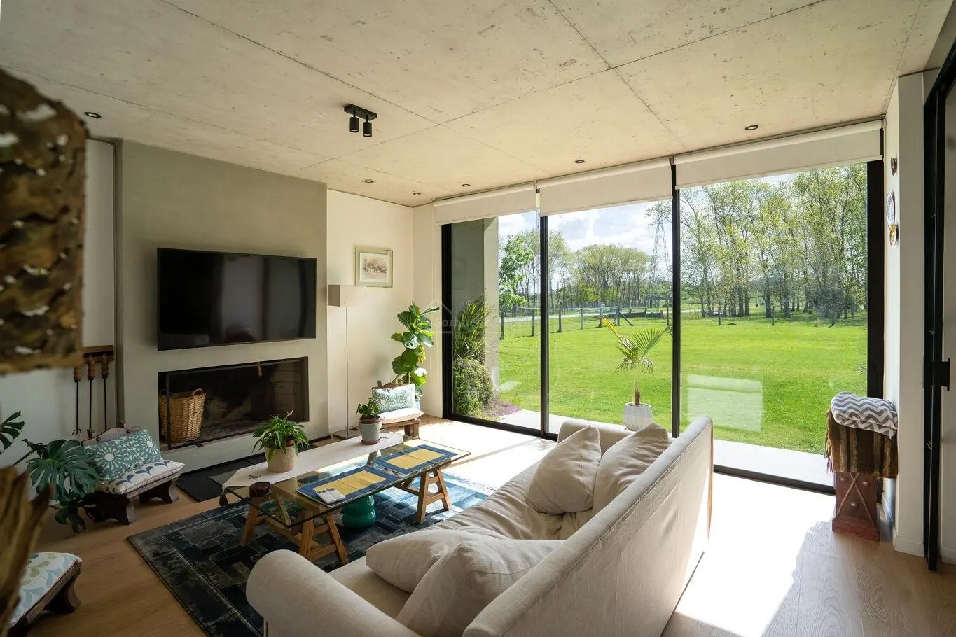 El luminoso living con una generosa estufa a leña invita a relajarse y disfrutar de la tranquilidad del entorno.