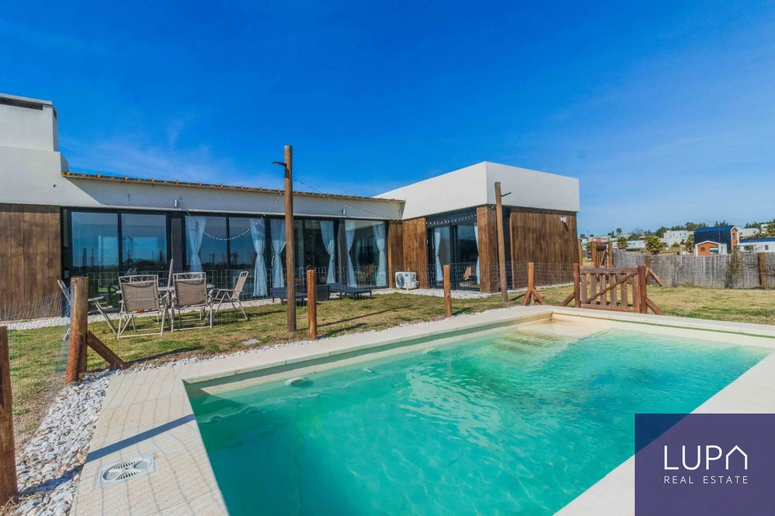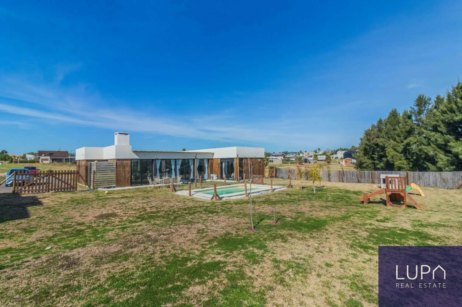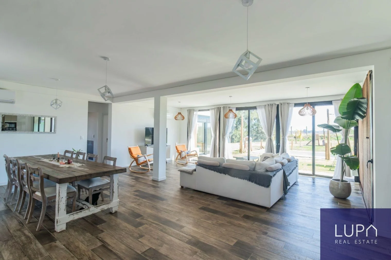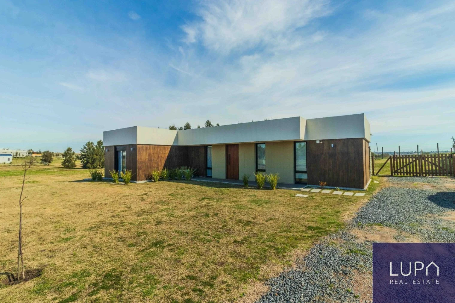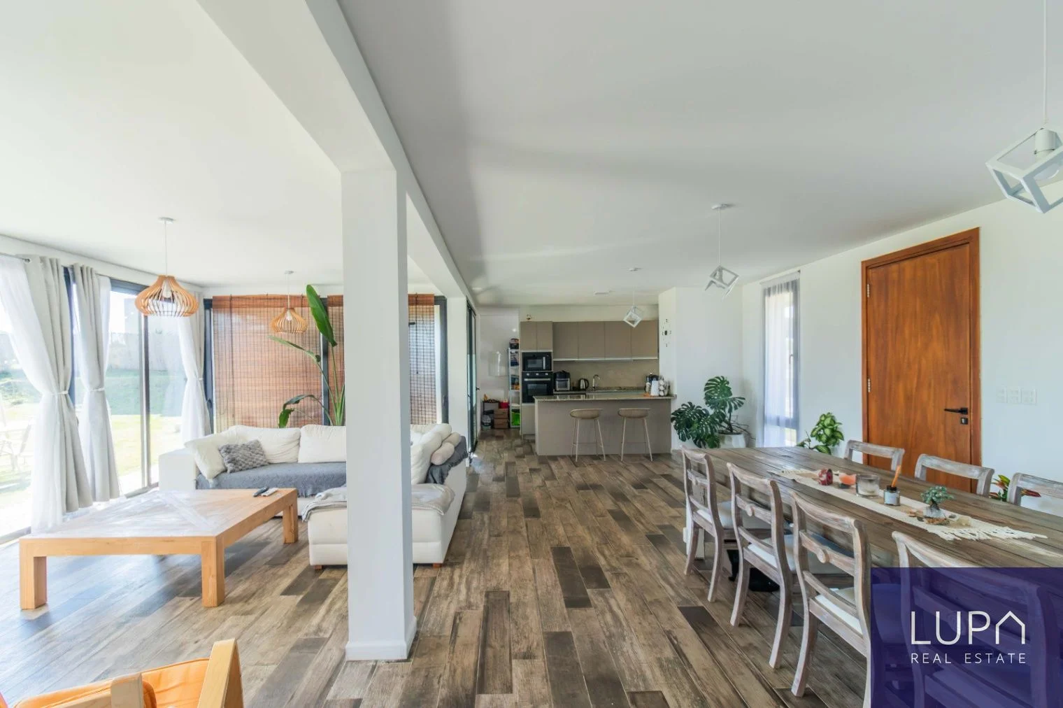 Esta casa de 185 m2 se desarrolla en una planta con un espacioso y funcional living comedor con su cocina semintegrada con una amplia barra desayunador y una practica barbacoa cerrada que puede integrase al living comedor. La misma fue realizada con un sistema de construcción mixto que combina muros de ladrillo, mampostería y cubiertas en PIR, además de revestimiento de yeso en todas las paredes interiores. A la salida del living la continua una hermosa salida a un jardin amplio formada por amplios ventanales que unen y permiten disfrutar el interior y el exterior al integrarlos.