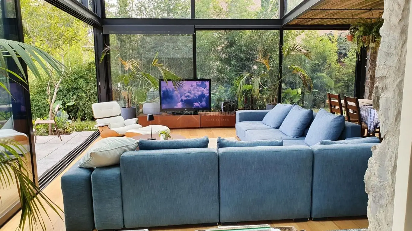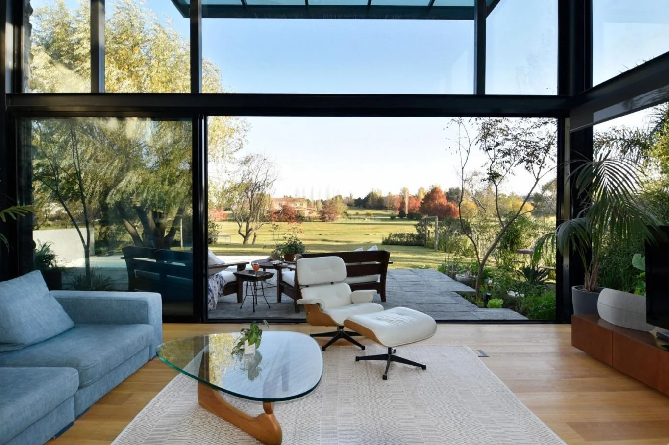 Living comedor principal de 7.50 x 7.50 totalmente abierto e integrado a la naturaleza exterior.