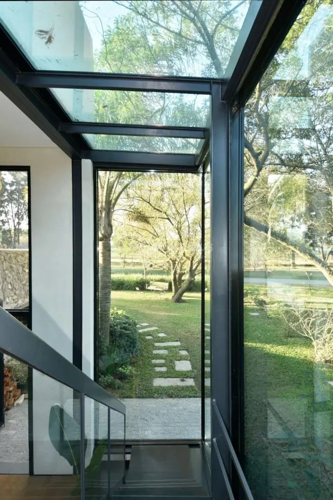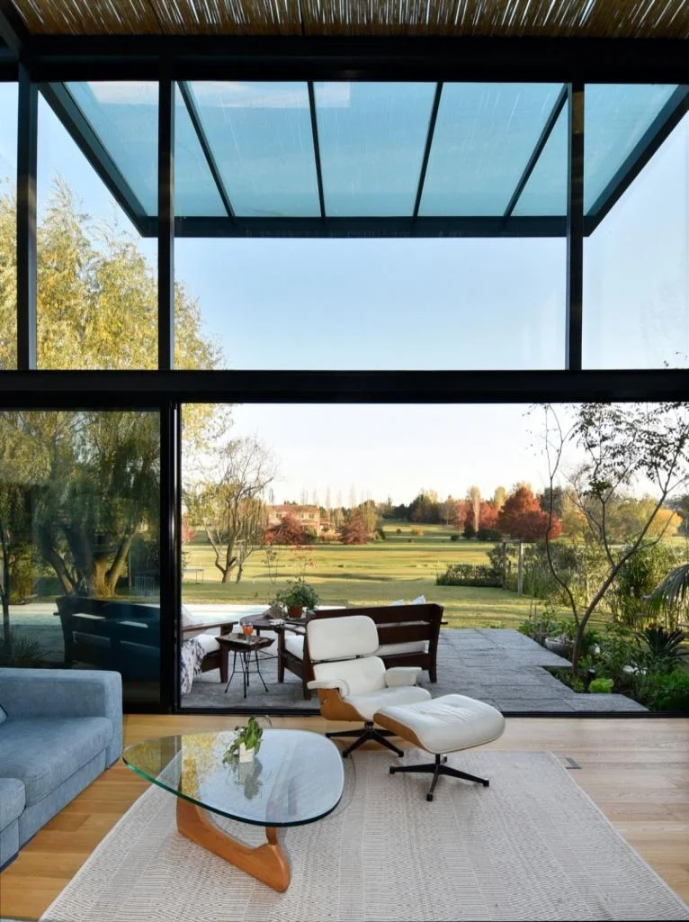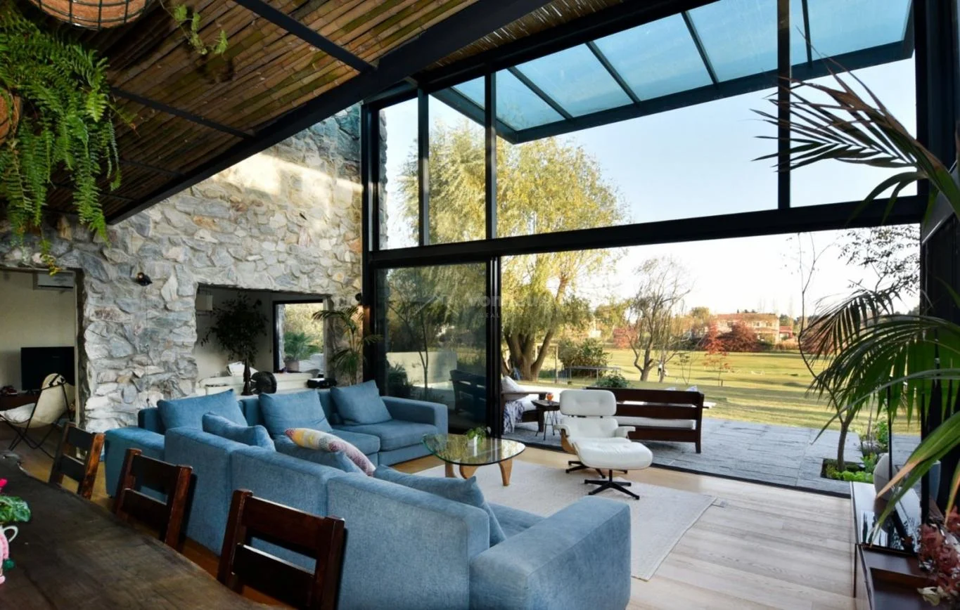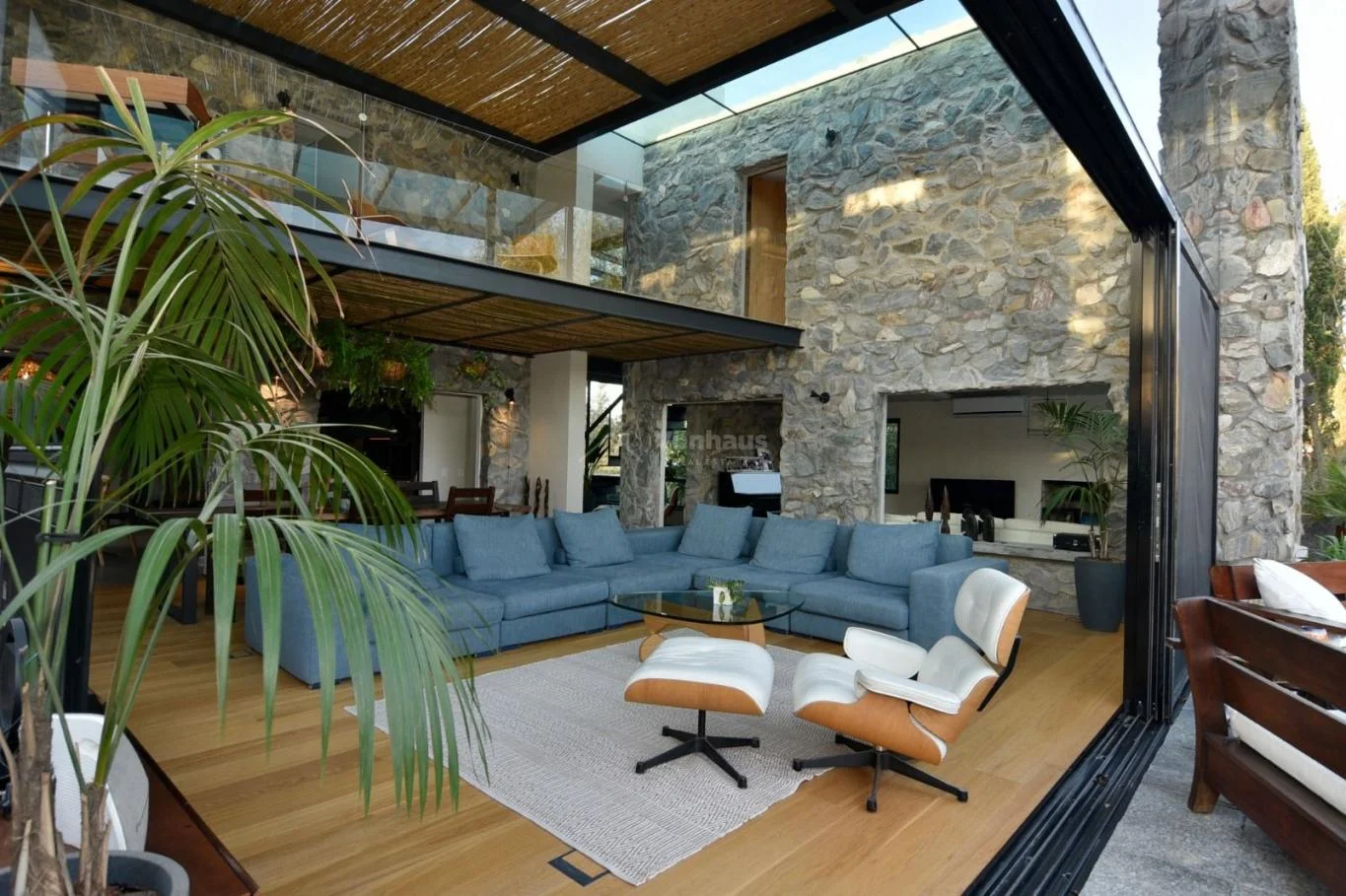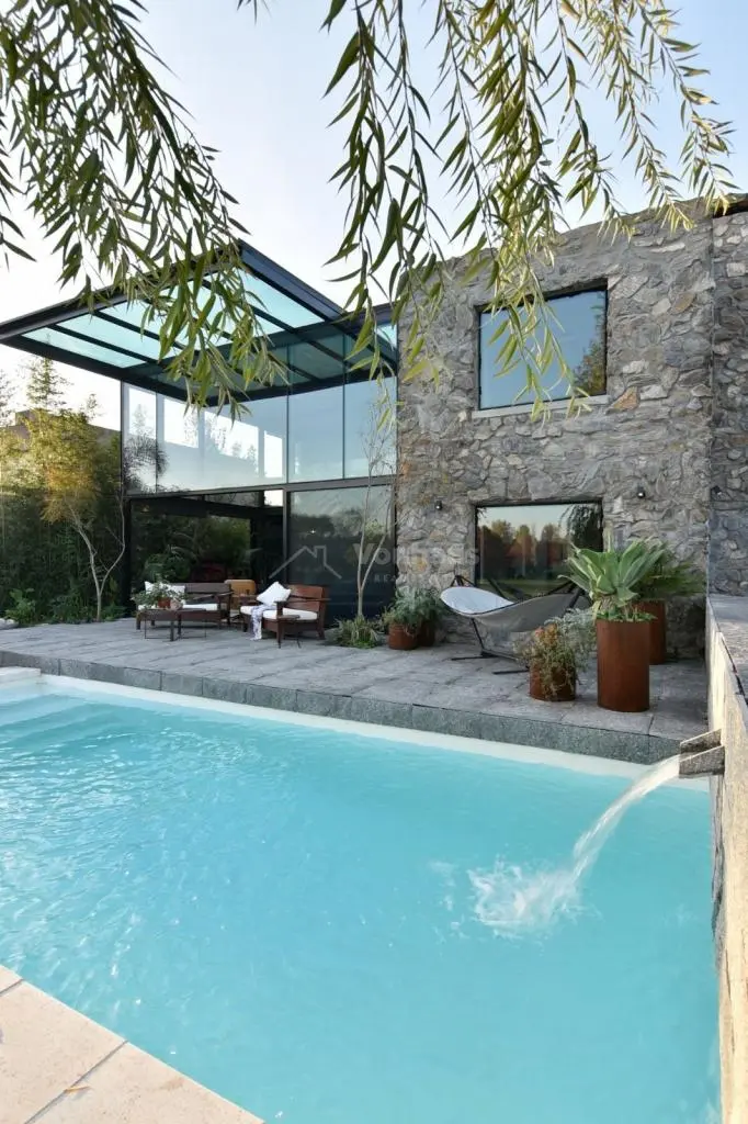 Construida con materiales nobles como el vidrio y la piedra como protagonistas, con una integración total de los espacios ya que los mismos son abiertos, permitiendo su uso de acuerdo a las necesidades.