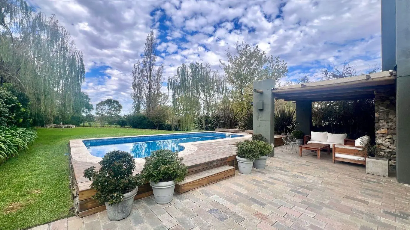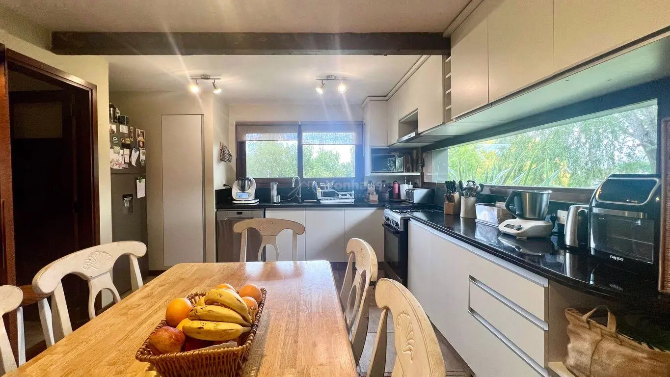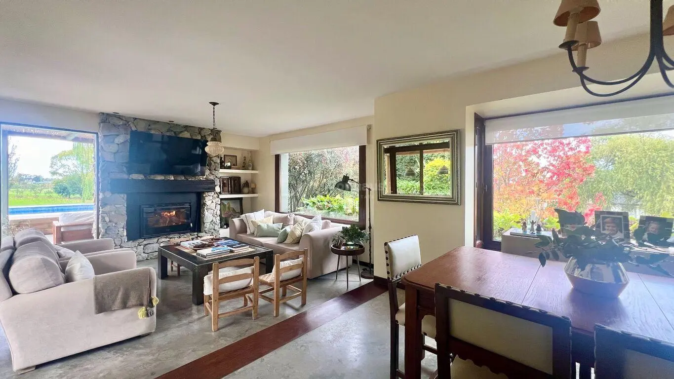 De construcción tradicional. En la planta baja, se encuentra una espaciosa sala de estar con una eficiente estufa, un acogedor living comedor, tambien con estufa a leña, y cocina definida con entrada independiente y desayunador. Desde el living se accede a un hermoso jardín, donde se encuentra una zona de parrilla con barra y pérgola cubierta, así como otra pérgola techada accesible desde la sala de estar, ambas con vistas al jardín, al campo de golf y a la piscina con deck de madera.