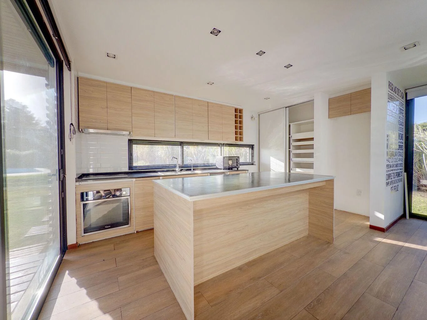 La cocina, espaciosa y muy luminosa, cuenta con isla central, patio interno techado y salida lateral hacia el jardín, integrando comodidad y practicidad.