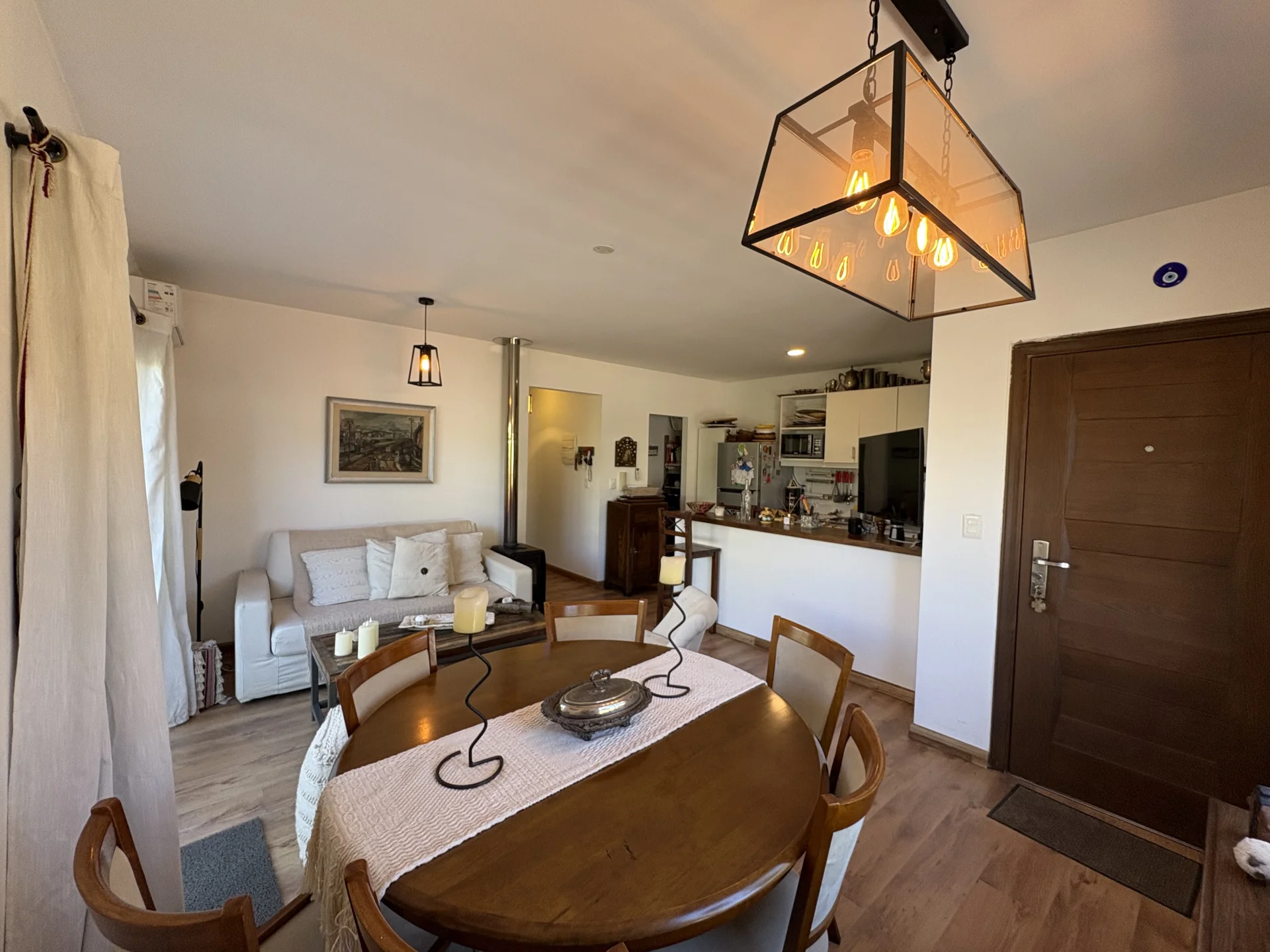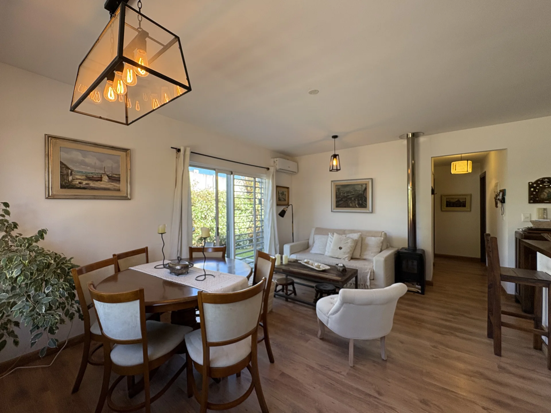 Living comedor con estufa de alto rendimiento y ventanales que dan acceso a muy lindo espacio exterior.