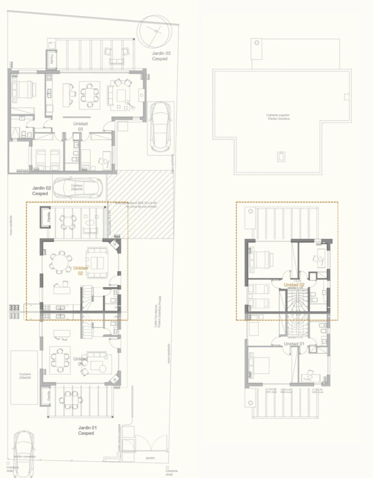 Complejo cerrado conformado por 3 unidades independientes. Cada una con sus respectivos espacios exteriores de jardín de uso exclusivo y cocheras individuales. En una ubicación privilegiada: a una cuadra de la Rambla Costanera, cercano al centro comercial Geant del Parque Roosvelt y a cinco minutos del centro de Carrasco o del Aeropuerto.