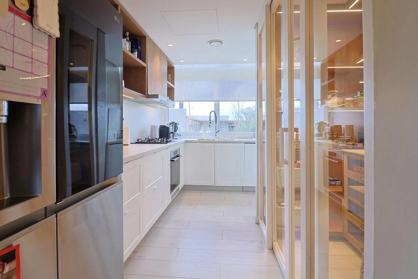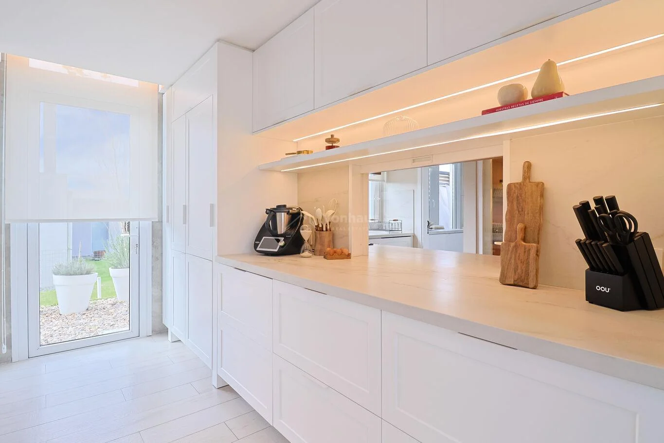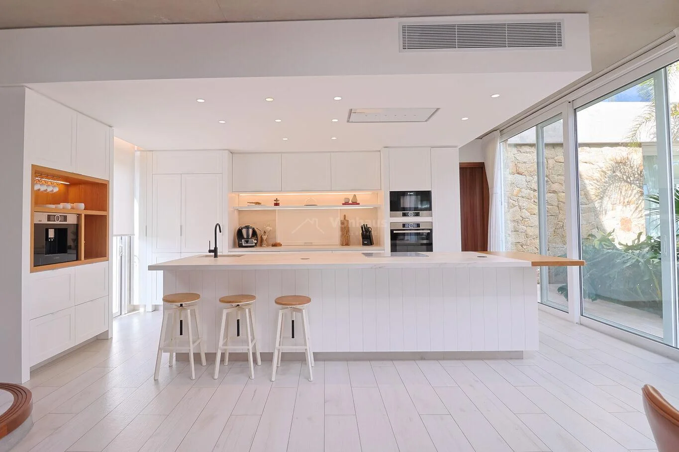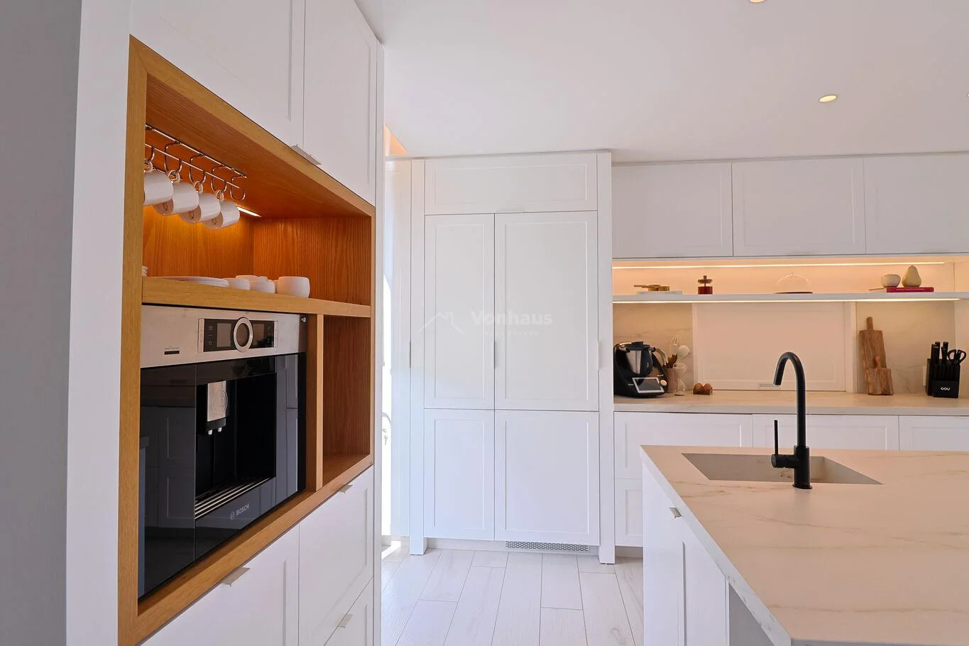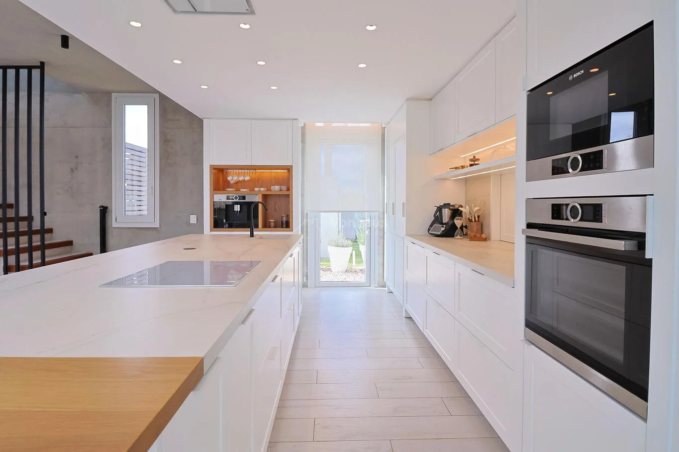 Cocina principal definida con pasaplatos. Equipada con electrodomésticos Bosch: horno electrico, hornallas a gas, y heladera con freezer. Mesadas Dekton.