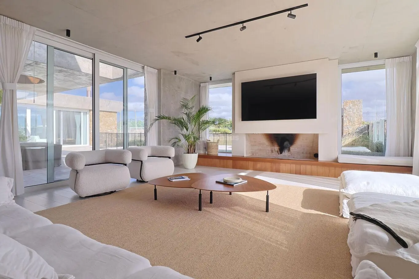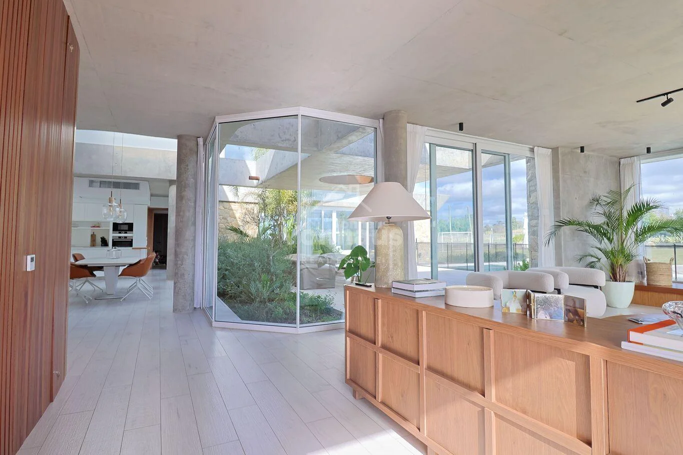 Gran hall de distribución con amplios ventanales con cortinas electricas en la parte superior.