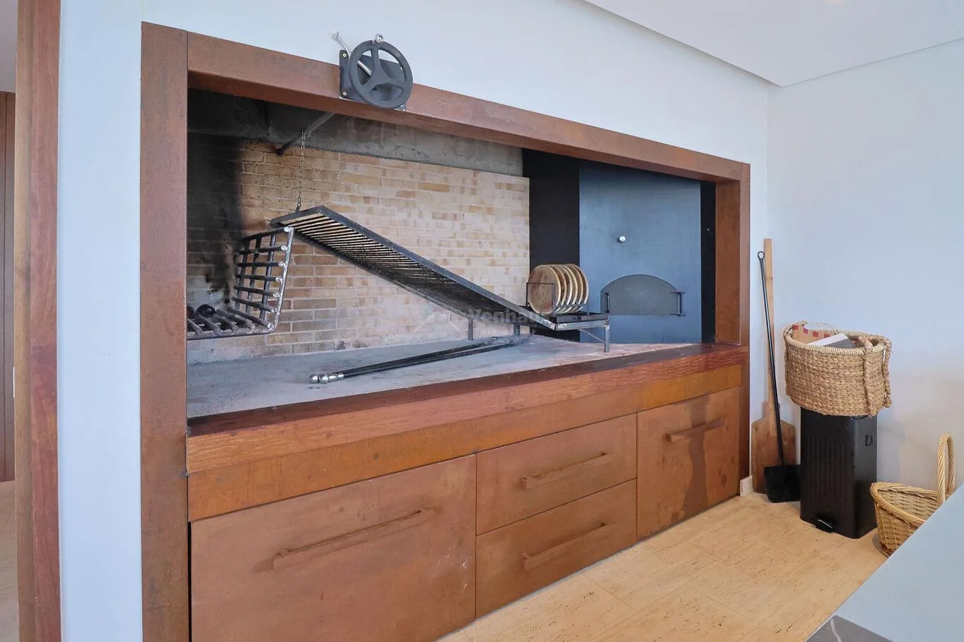 Gran barbacoa con parrillero unida a la casa principal a traves de la cocina, y con ventanales hacia el jardin.
