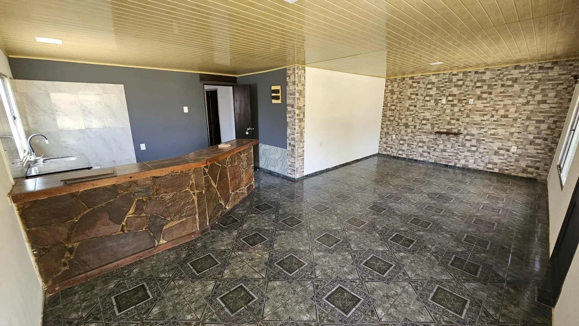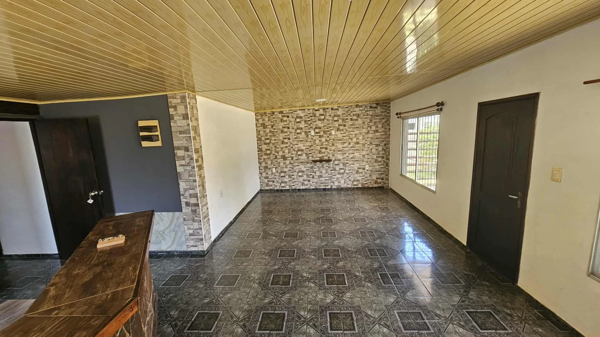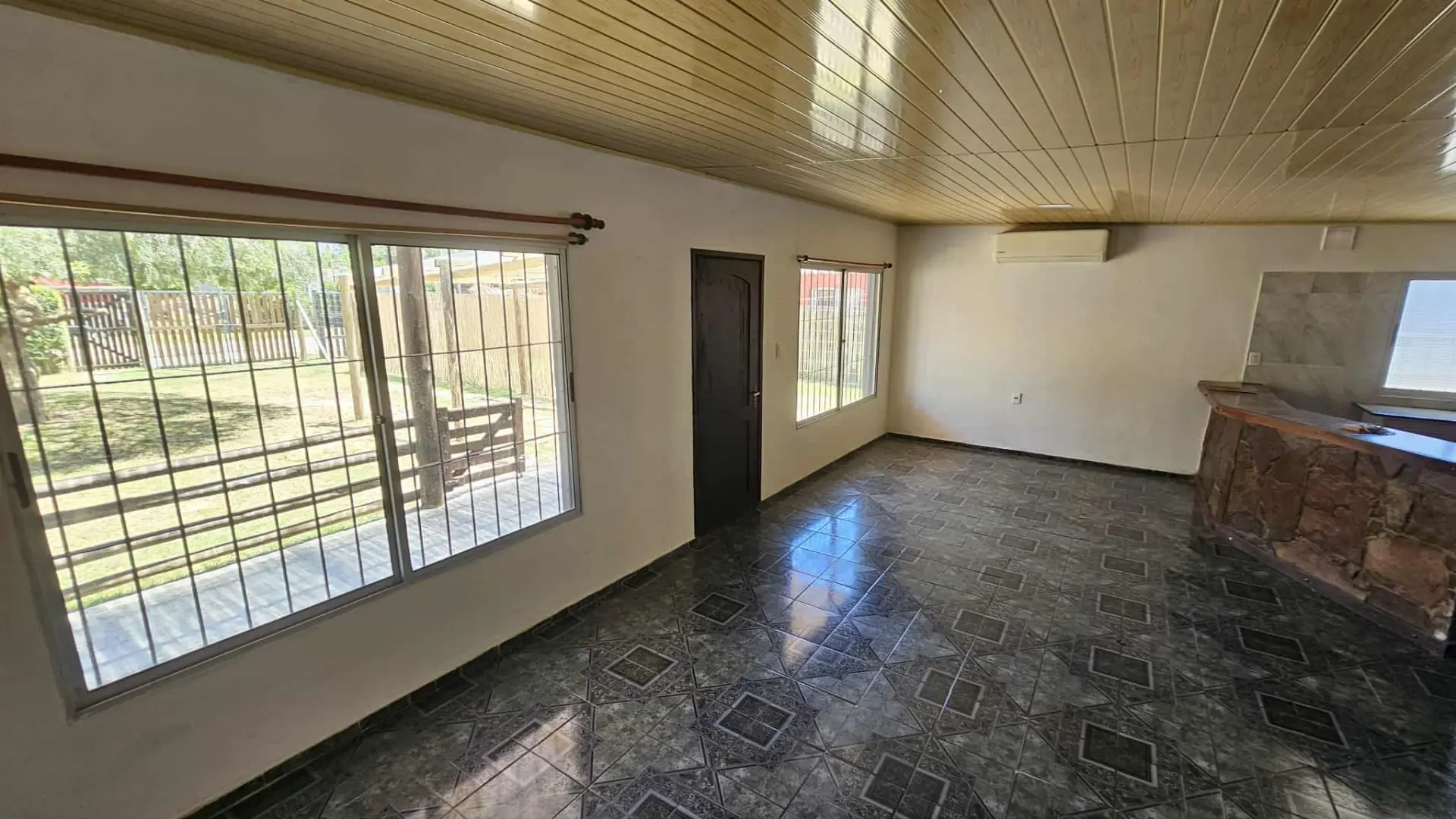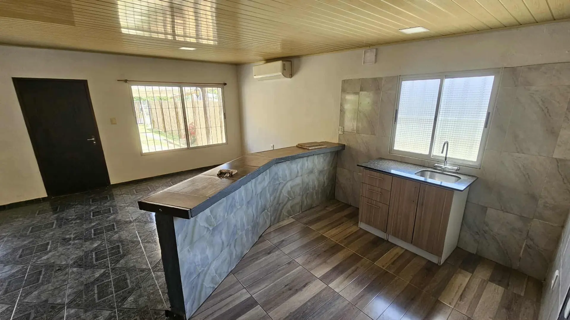 Ambiente social, al frente, super amplio, semi integrado por barra separativa a cocina. Tiene aire acondicionado.