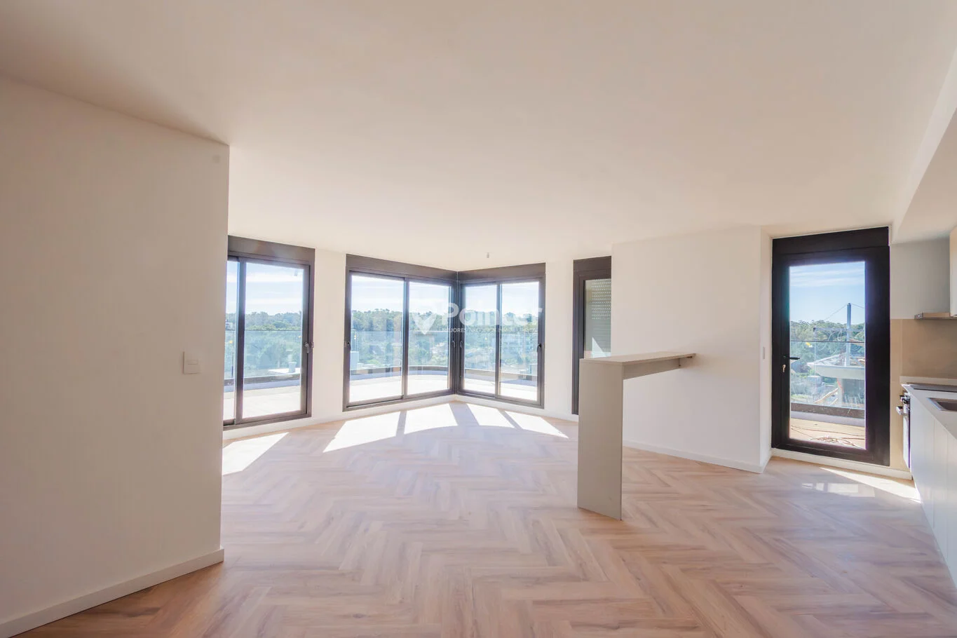 Amplia terraza en forma de U que rodea todo el apartamento; con acceso directo desde cada uno de sus ambientes, generando una conexión fluida entre interior y exterior.