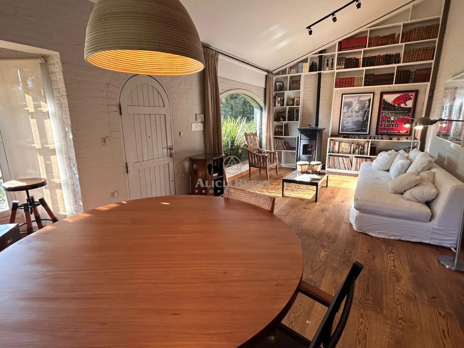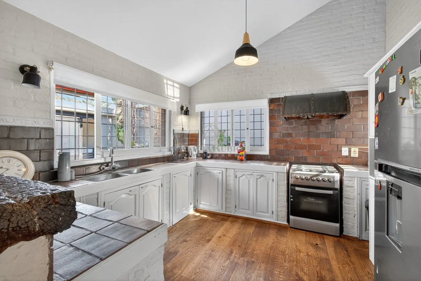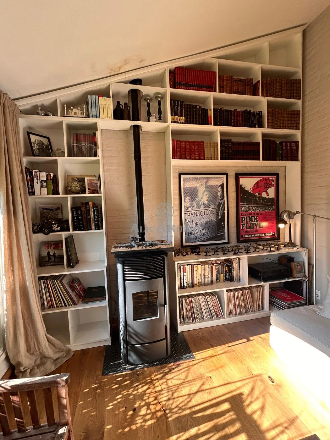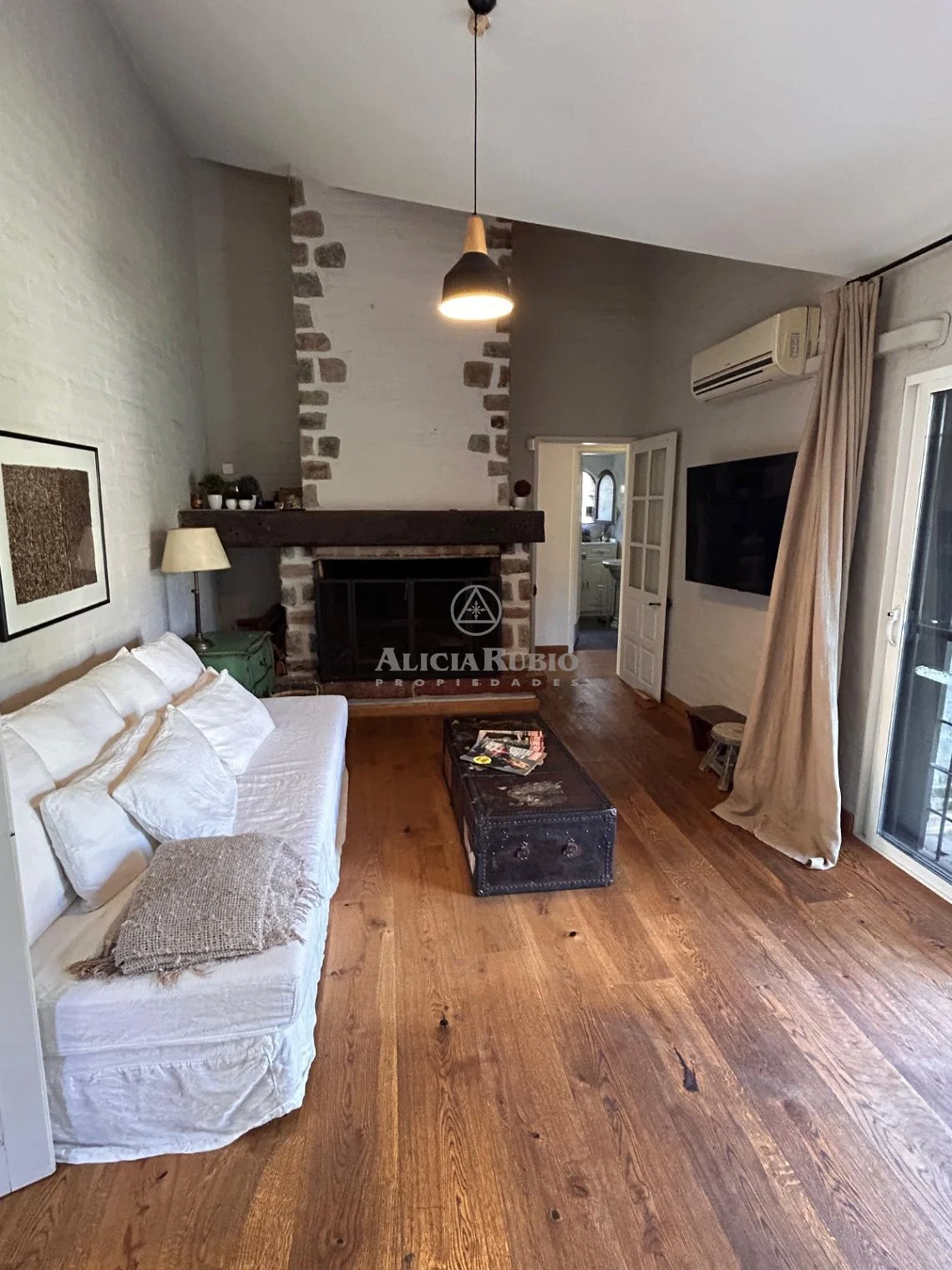 Estar con Estufa leña integrado a divina cocina con muchos placares.