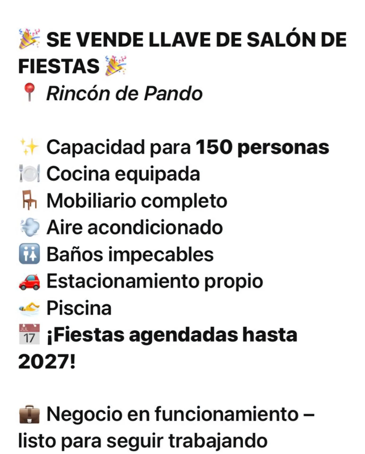 Se vende llave de salón de fiestas, 5000 metros de terreno, 370 metros edificados, salón totalmente equipado, 15 mesas redondas, 200 sillas, 2 heladeras, 1 frizer, 1 caba de vinos, microondas, horno de pizzas, baño completo, piscina, pergola, parrillero, estacionamiento propio, capacidad para 150 personas, aire acondicionado, con reservas para los próximos meses. CABE DESTACAR QUE SE VENDE LA LLAVE!! ALQUILER POR 10 AÑOS DE TODO EL COMPLEJO EN USD 1500 CONSULTE POR MÁS INFORMACIÓN GALVIZZI PROPIEDADES ***