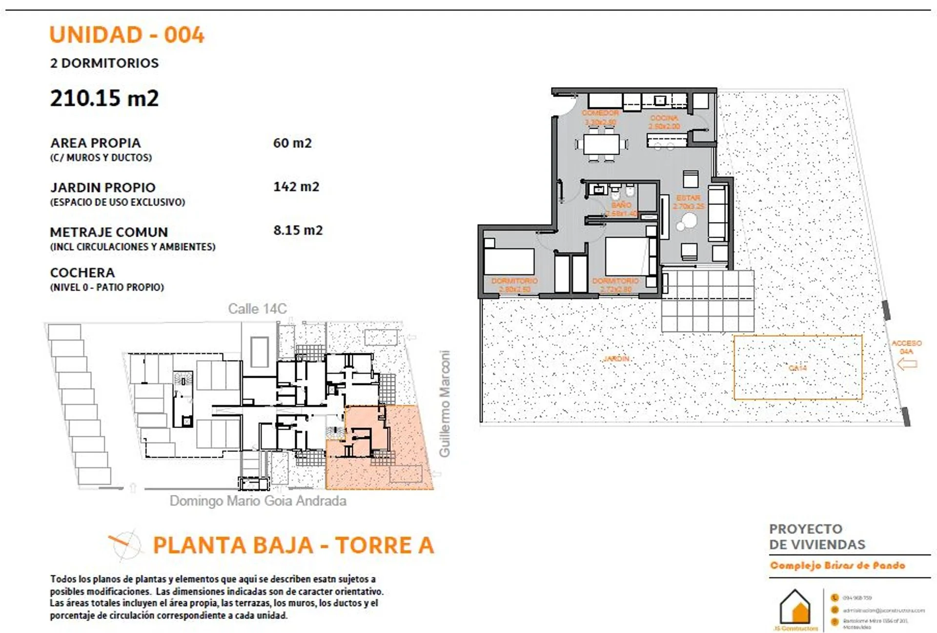 La unidad 004 de la torre A, está ubicada en planta baja, cuenta con 60m² propios de apartamento (living, cocina comedor, lavadero, baño y dos dormitorios), 142m² de jardín de uso exclusivo con cochera, acceso directo desde la calle mediante portones automatizados. Todo esto hace de ésta unidad una individualidad única, casí como una casa pero dentro de un complejo con los mejores amenities de la zona.