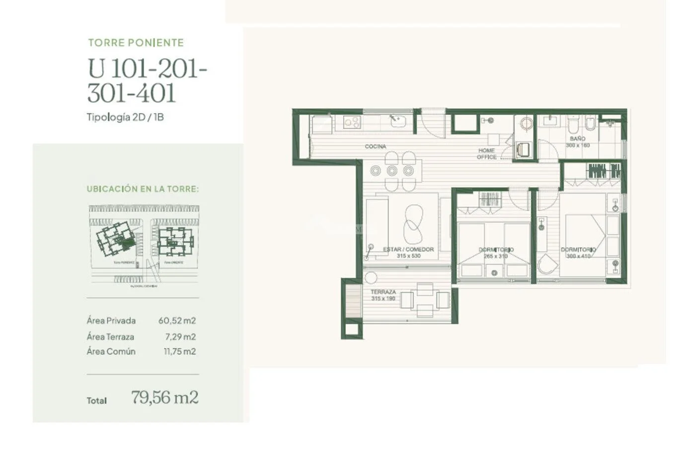 101) 60,52m2 área privada + 7,29m2 área terraza + 11,75m2 área común = 79,56m2 Totales.