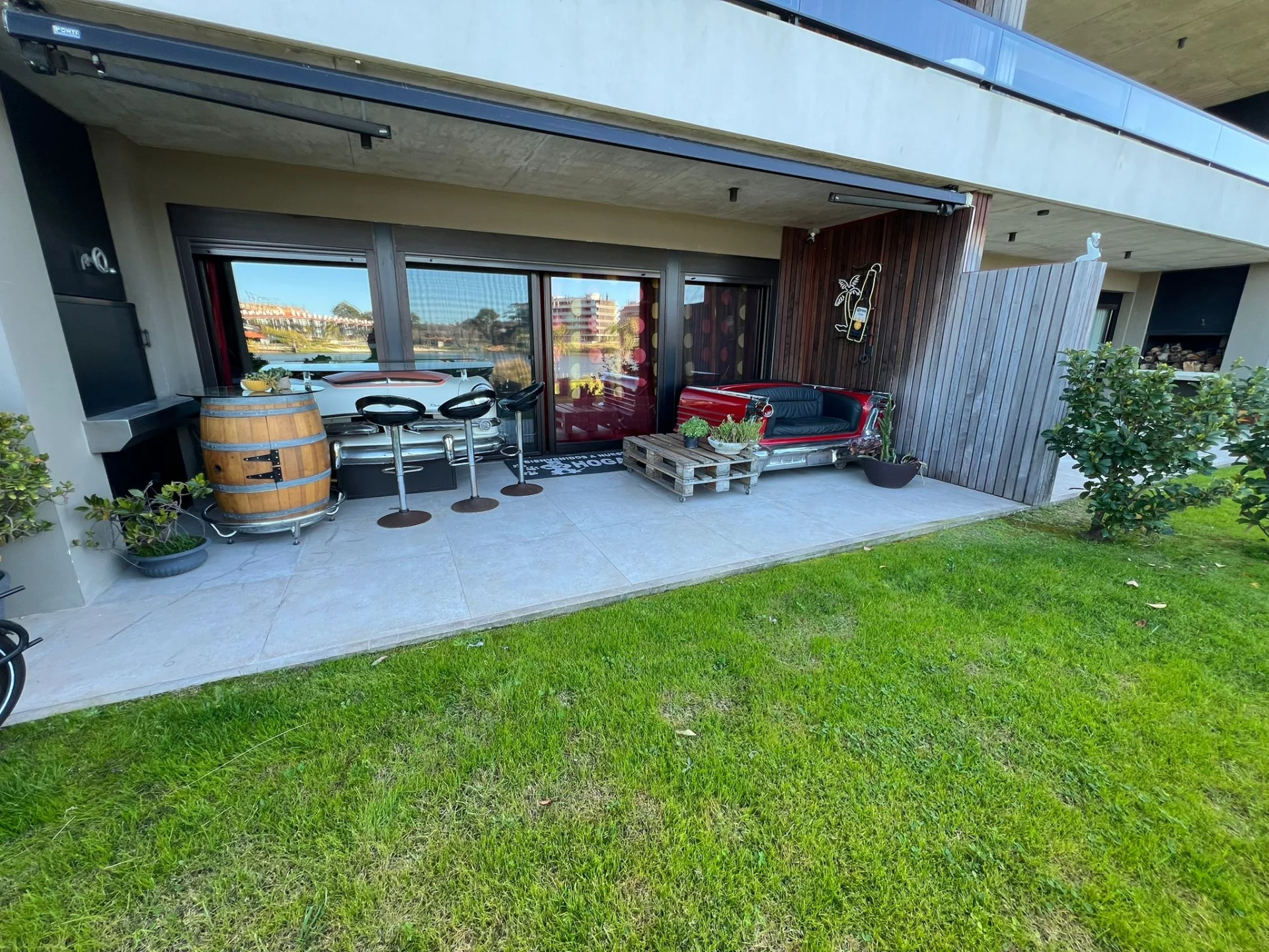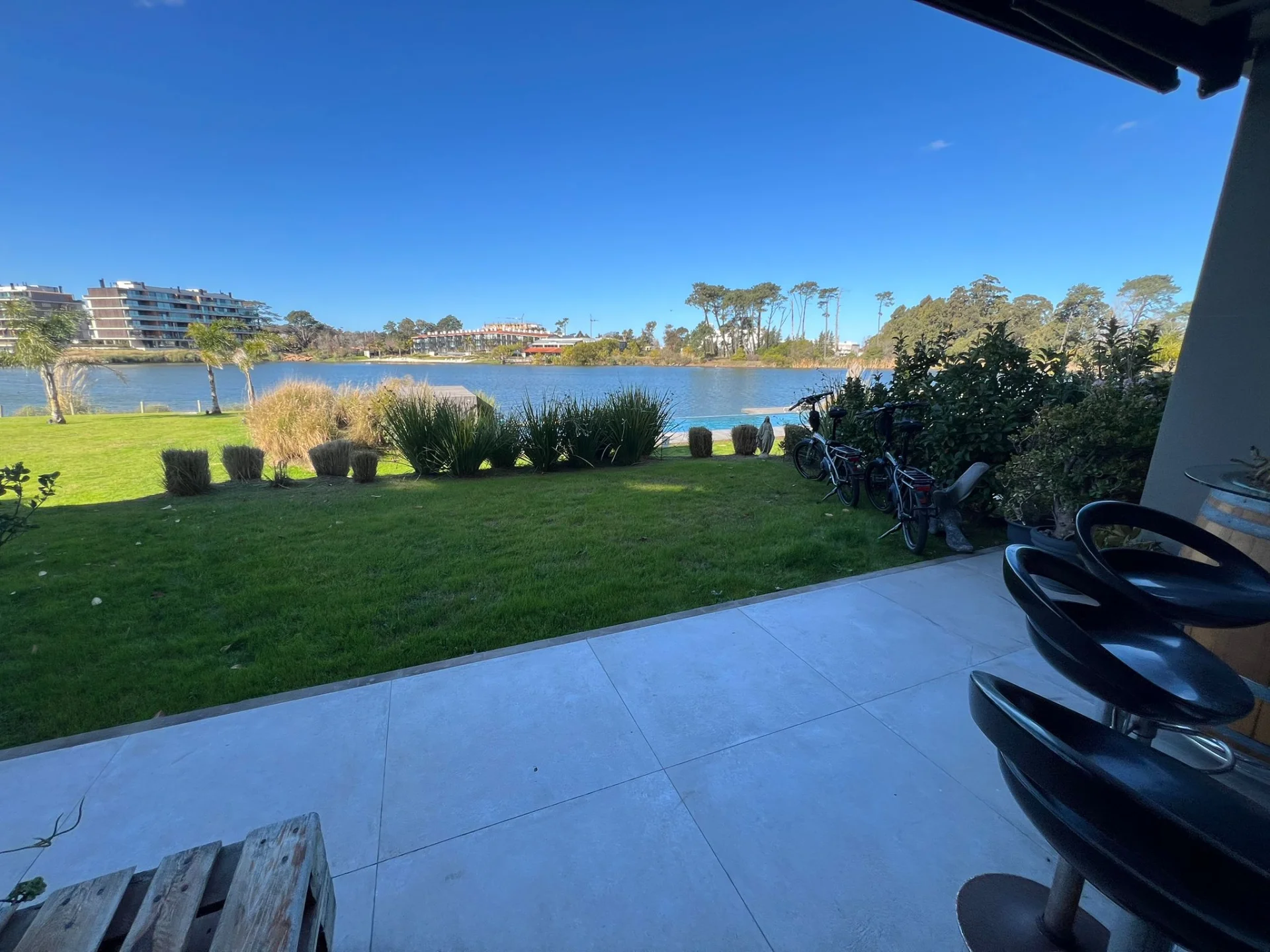 Patio interior y patio con parrillero también con vista al lago