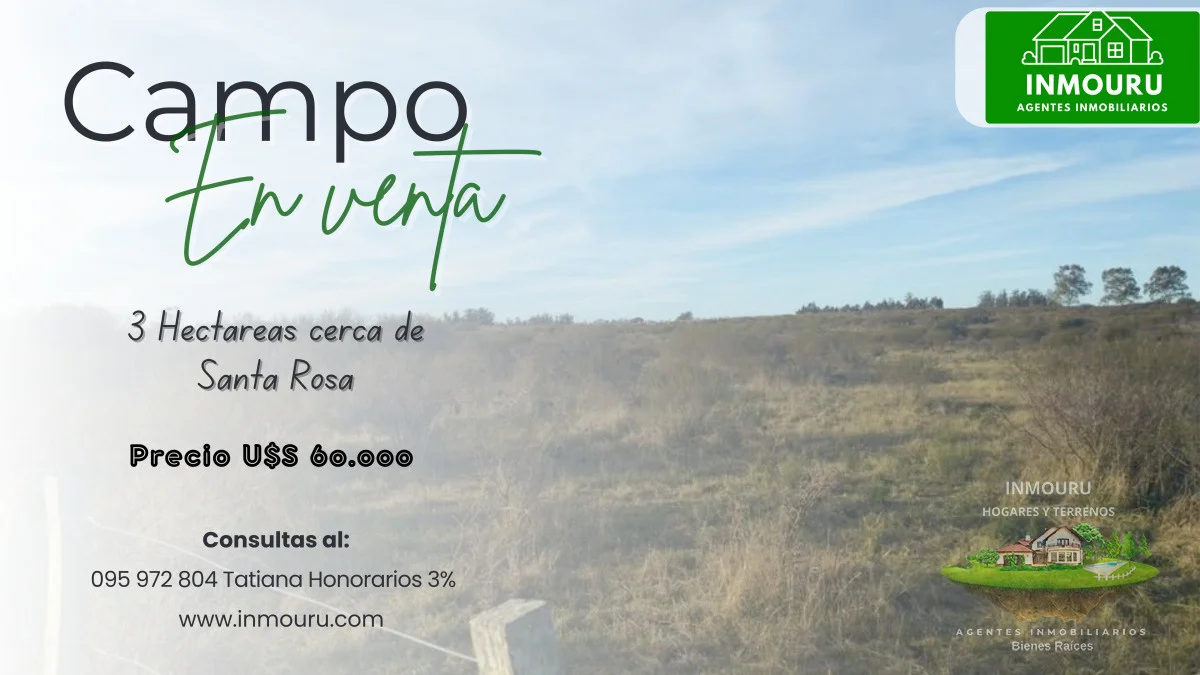 Venta de campo en Santa Rosa Precio U$S 60.000 Son 3,3 hectáreas sin edificaciones. Ubicado a 4 kilómetros de Santa Rosa. Ideal para construcción de vivienda o invertir en plantación. Se escuchan ofertas. Honorarios 3% Agente Tatiana Referencia Interna : Tera-1842