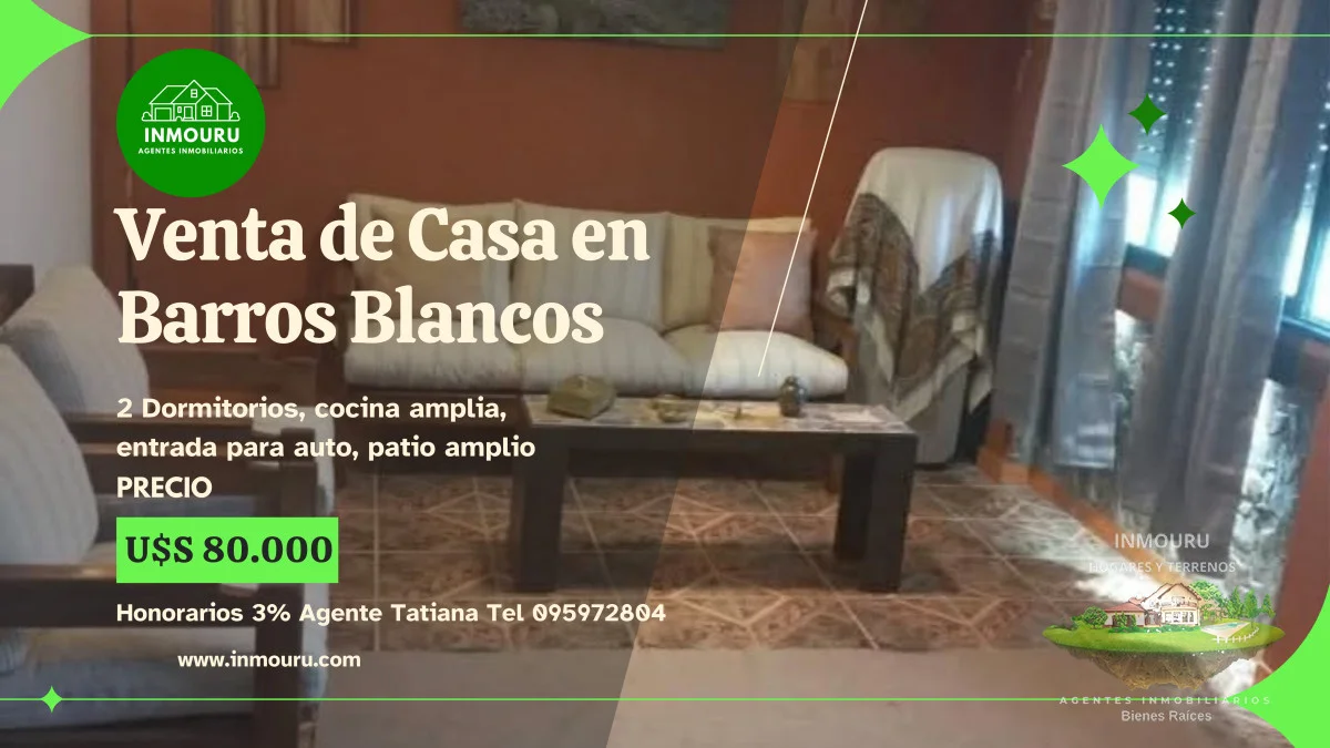 Venta de Casa en Barros Blancos Precio U$S 80.000 Cuenta con 2 dormitorios con opcion a 3, cocina amplia con mueble aereo y bajo mesada. Entrada para auto y amplio patio. Títulos y documentacion en regla. Se escuchan ofertas. Acepta Banco y ANV. Honorarios 3% Agente Tatiana Referencia Interna : Tera-1846
