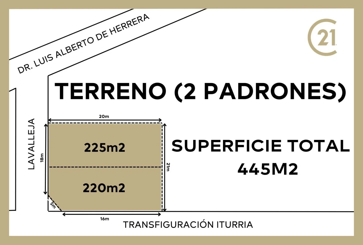 Esta dividido en dos padrones que en su totalidad suman 445m2.