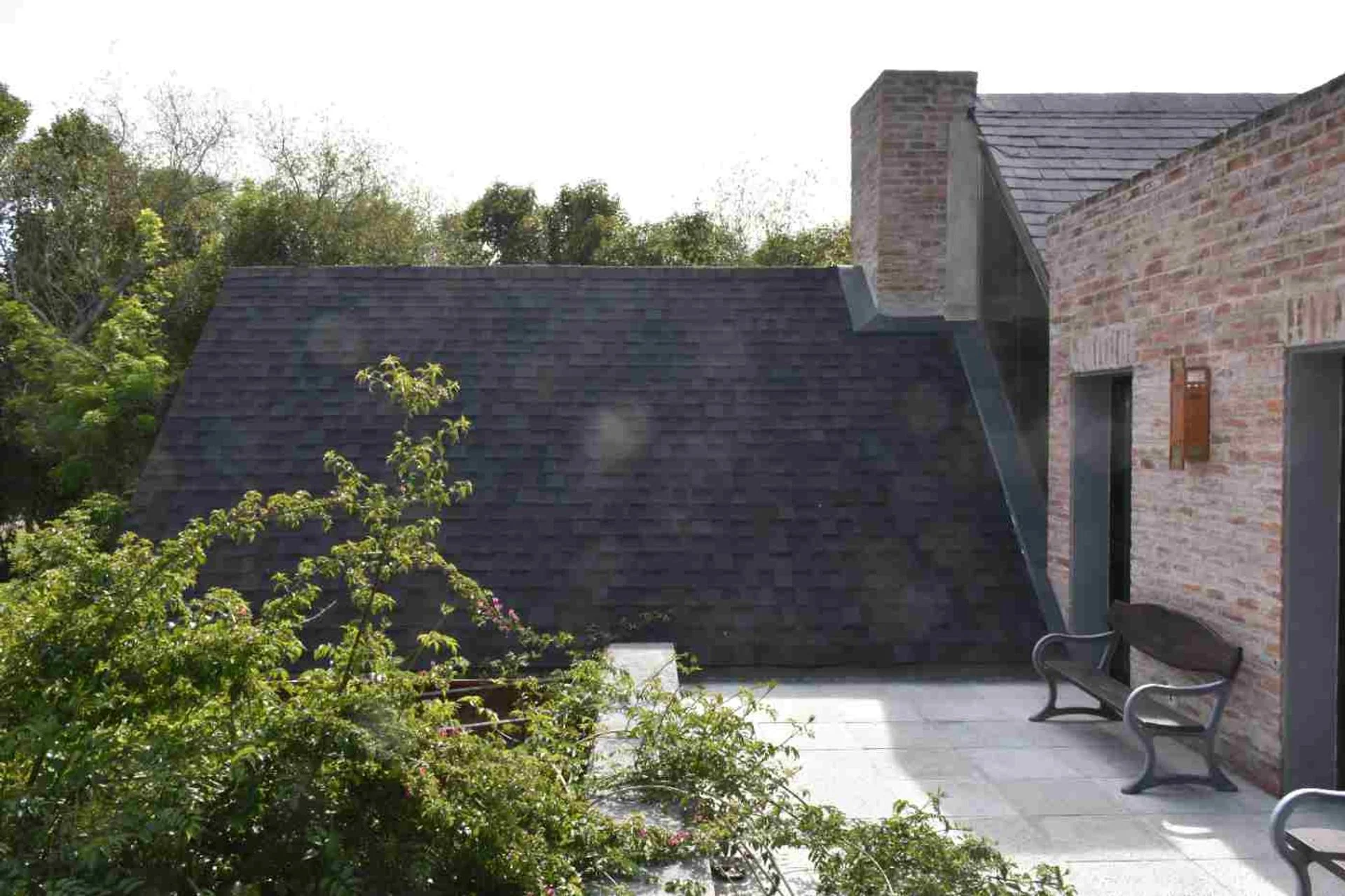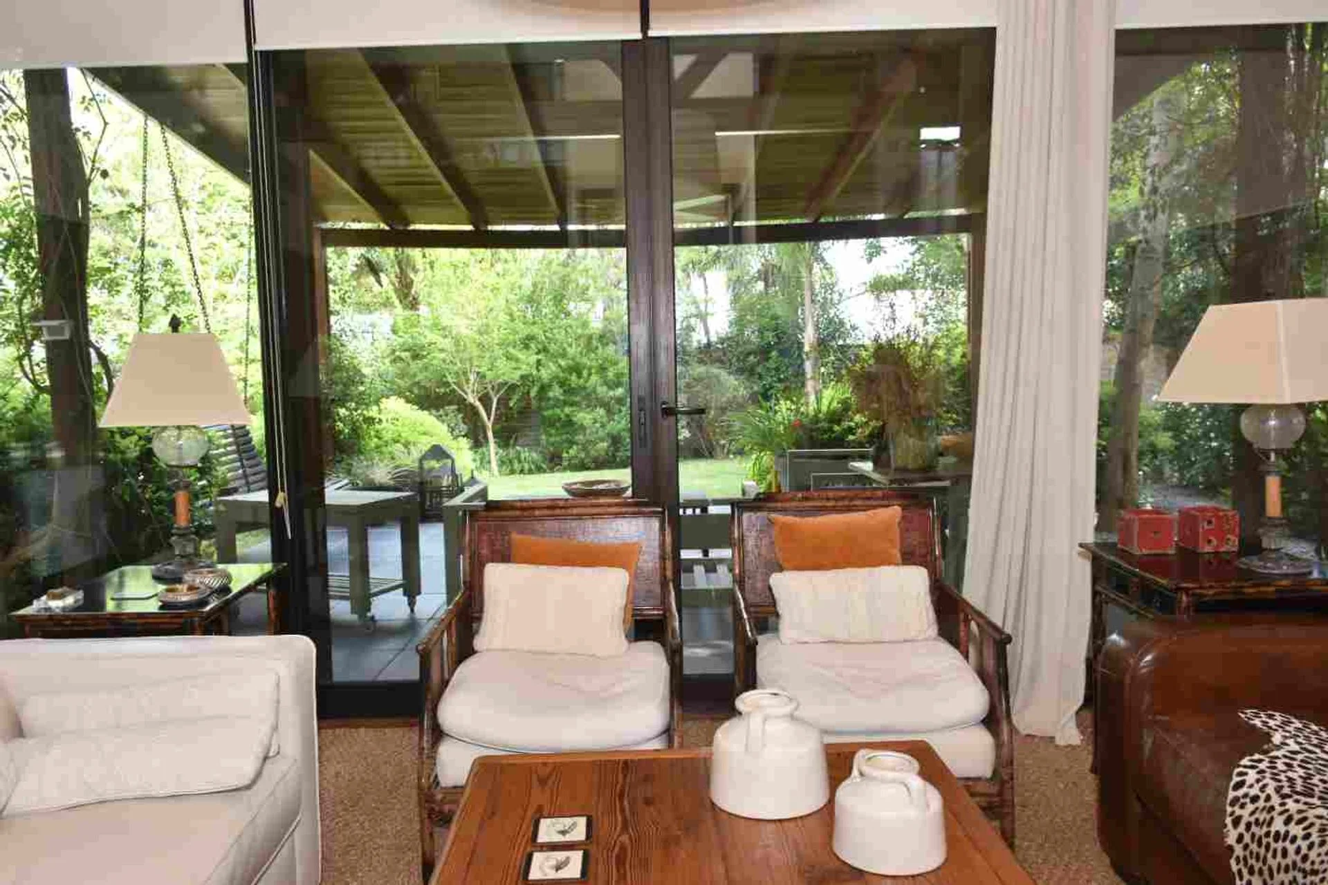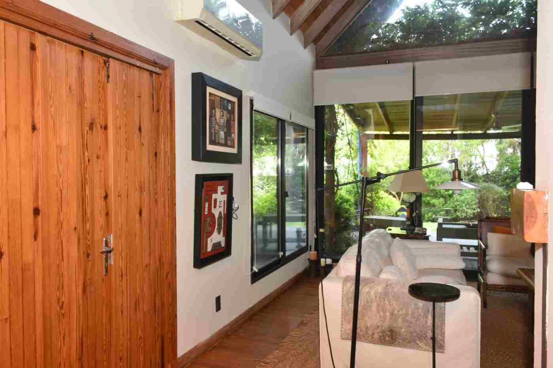 Construida en material tradicional, con ladrillos a la vista, techos de loza y detalles en pinotea, ofrece una calidez única en cada ambiente. Sus amplios ventanales bañan de luz natural todos los espacios, creando una sensación de amplitud y conexión con el entorno verde.