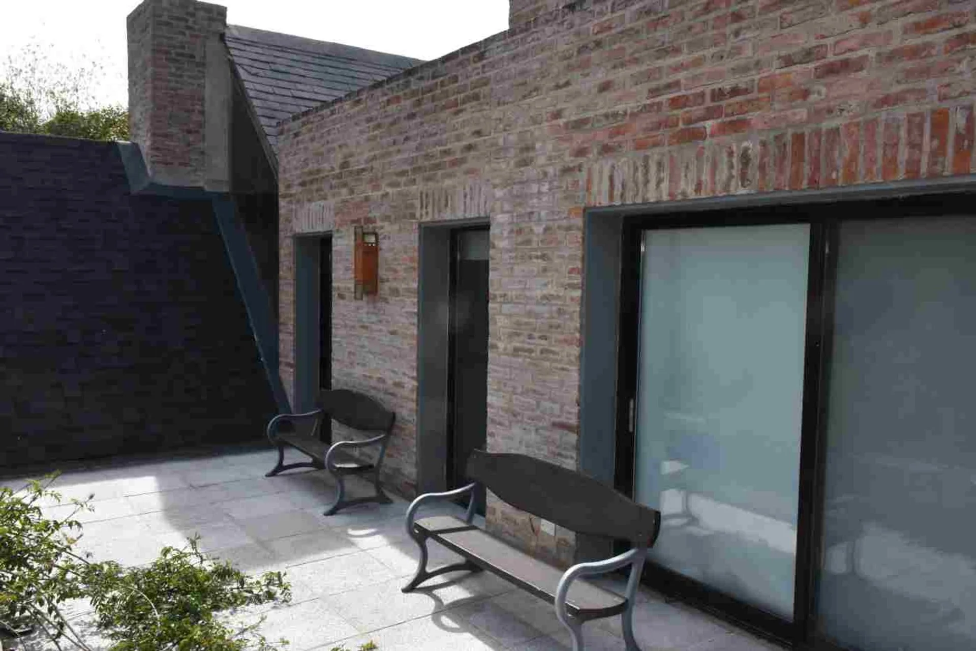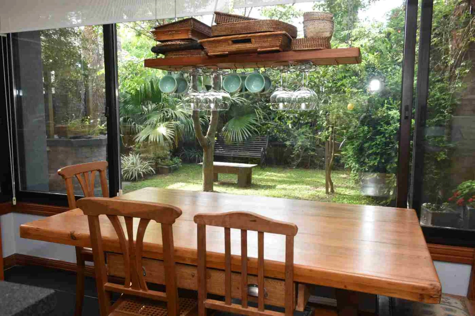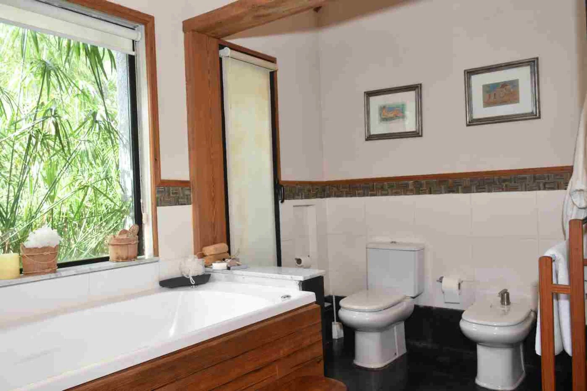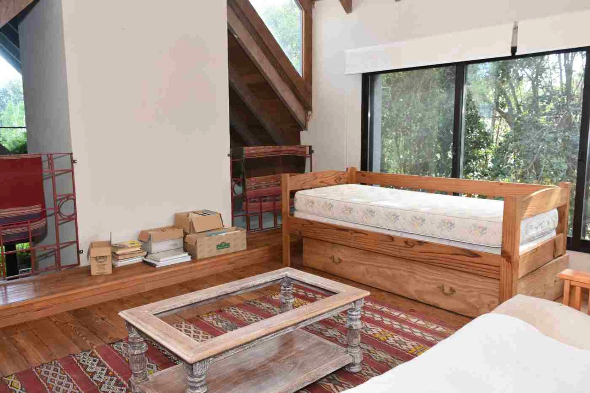 Construida en material tradicional, con ladrillos a la vista, techos de loza y detalles en pinotea, ofrece una calidez única en cada ambiente. Sus amplios ventanales bañan de luz natural todos los espacios, creando una sensación de amplitud y conexión con el entorno verde.