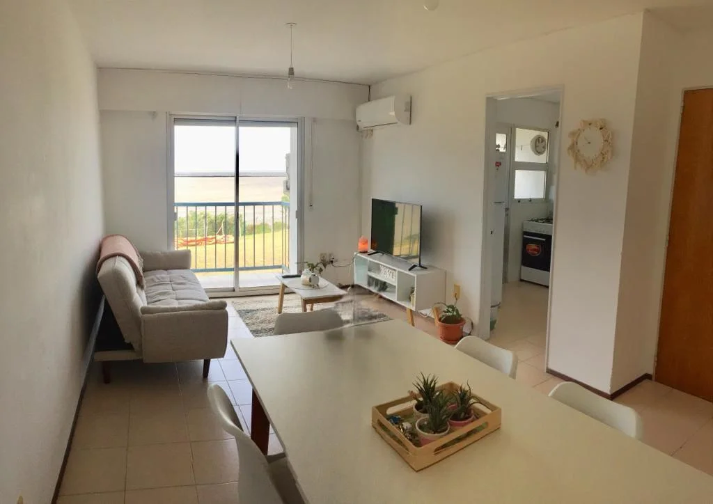 El apartamento dispone de dos dormitorios, proporcionando suficiente espacio para una familia o para quienes necesitan un ambiente adicional para oficina o estudio. El baño completo complementa el diseño inteligente de la unidad. La cocina, equipada para satisfacer las necesidades modernas, se conecta con un comedor diario, ideal para reuniones familiares o con amigos. El living comedor, amplio y luminoso, se integra con un balcón que ofrece vistas con hermosos atardeceres y al Rio, permitiendo disfrutar de la brisa y la luz natural, consta además de un pequeño lavadero.