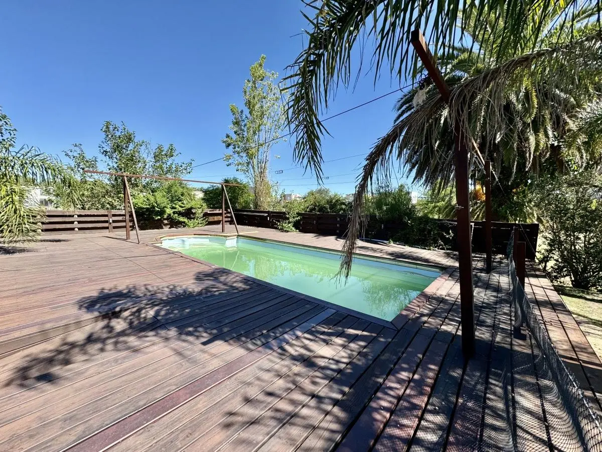Piscina de gran tamaño con un moderno deck de madera, proporcionando un ambiente ideal para disfrutar del sol y el aire libre. El diseño de la piscina complementa perfectamente la arquitectura de la casa y el entorno natural.