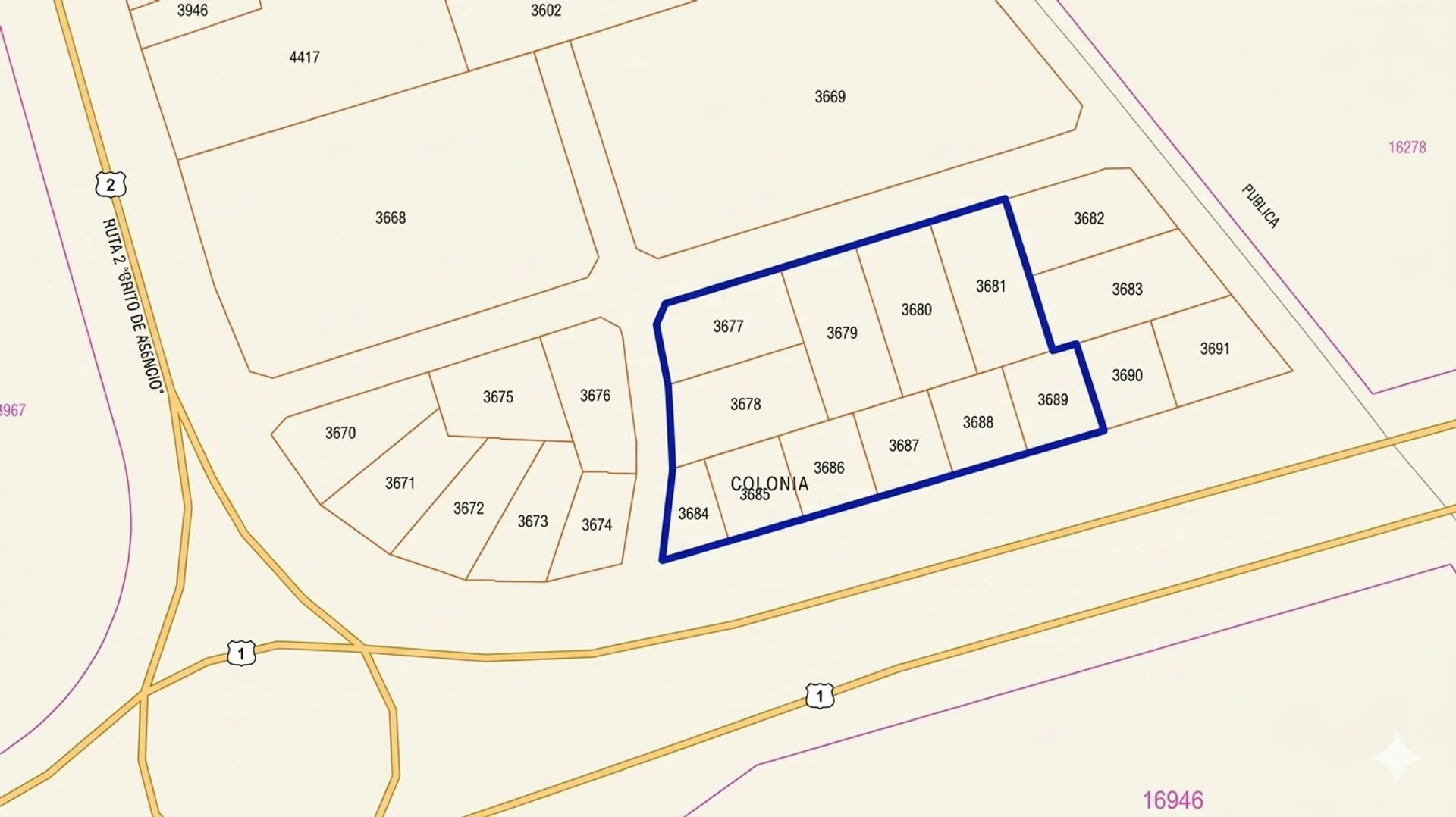 Superficie: 9.474 m² distribuidos en 8 padrones (3677 al 3681, 3684 al 3686).