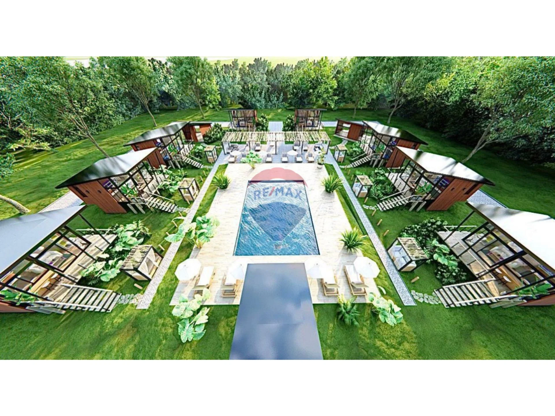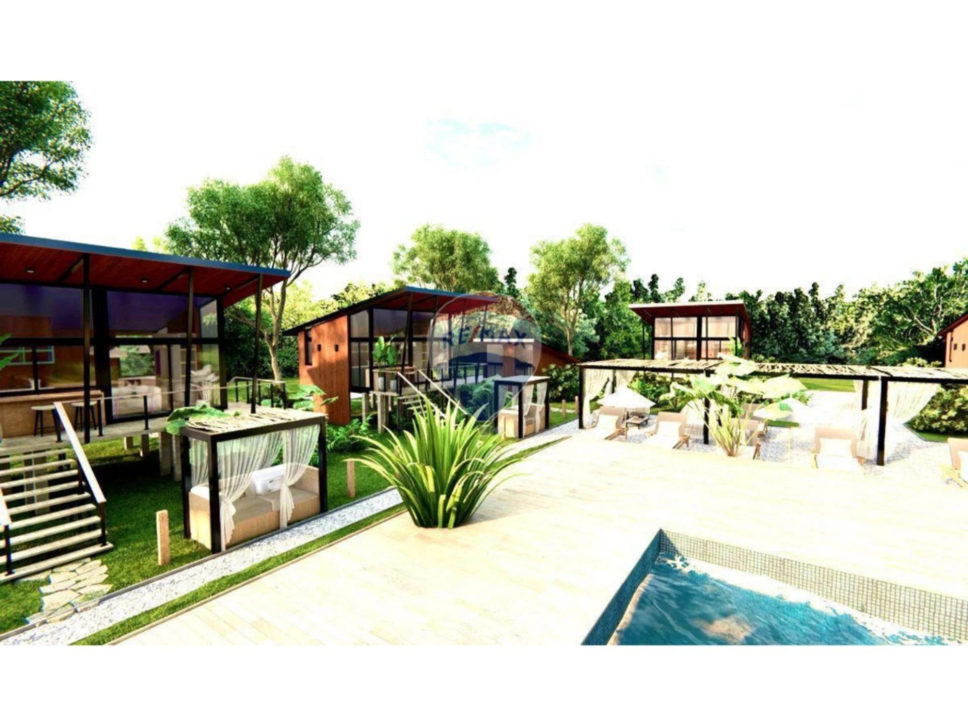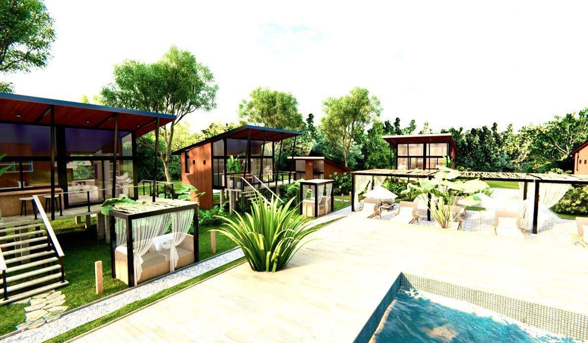 El proyecto es realizado en un predio cercado, con piscina en deck central y espacios comunes. Cada una de las cabañas sigue el mismo lineamiento de diseño vanguardista en el que predomina un material tan noble como lo es la panelería en madera tanto en interior como en exterior. Las estructuras son de hierro y hormigón y elevadas del nivel del piso. Además, sus amplios ventanales con vista a la laguna solis permiten notarse rodeadas de amplios espacios verdes.
