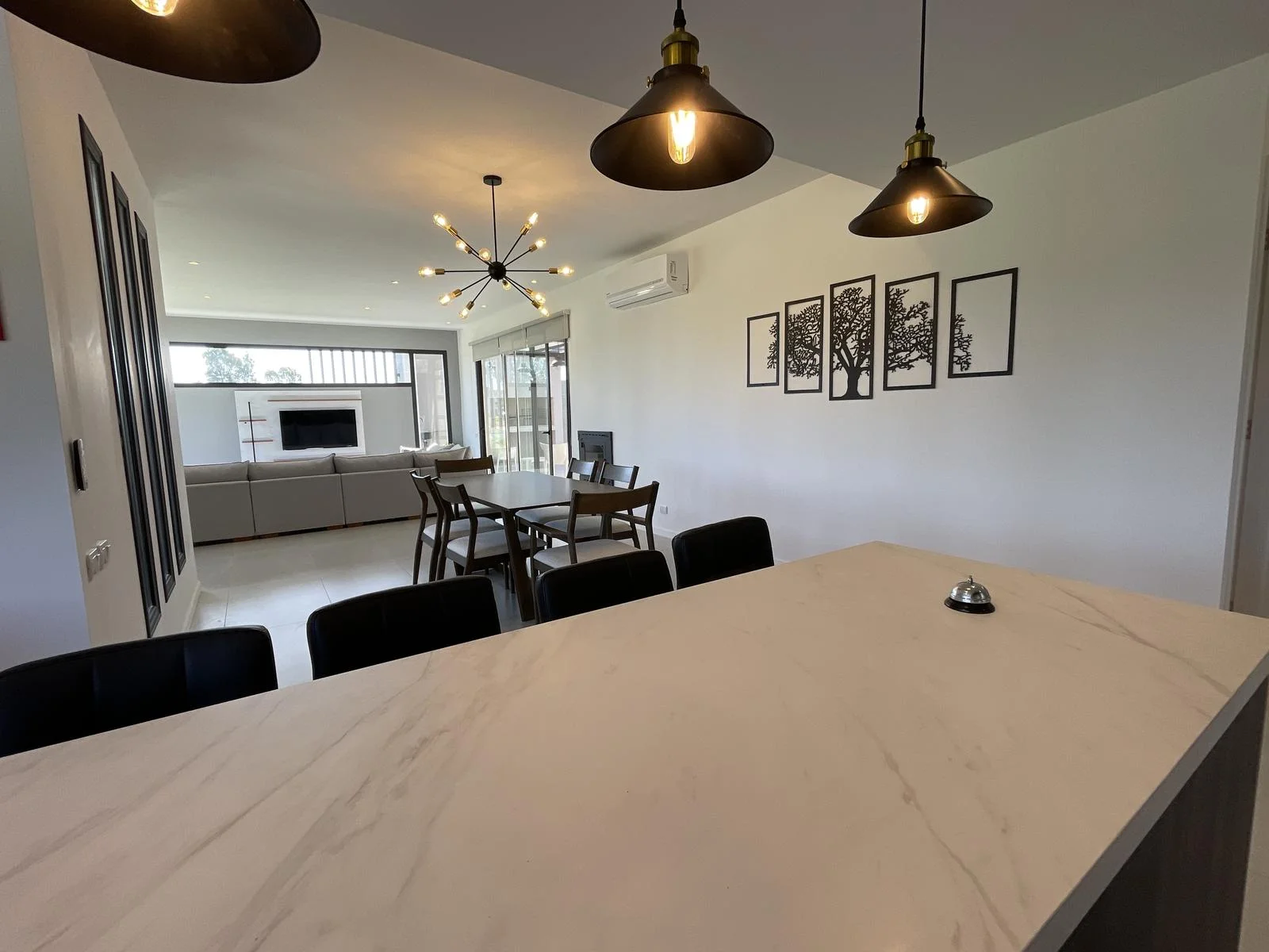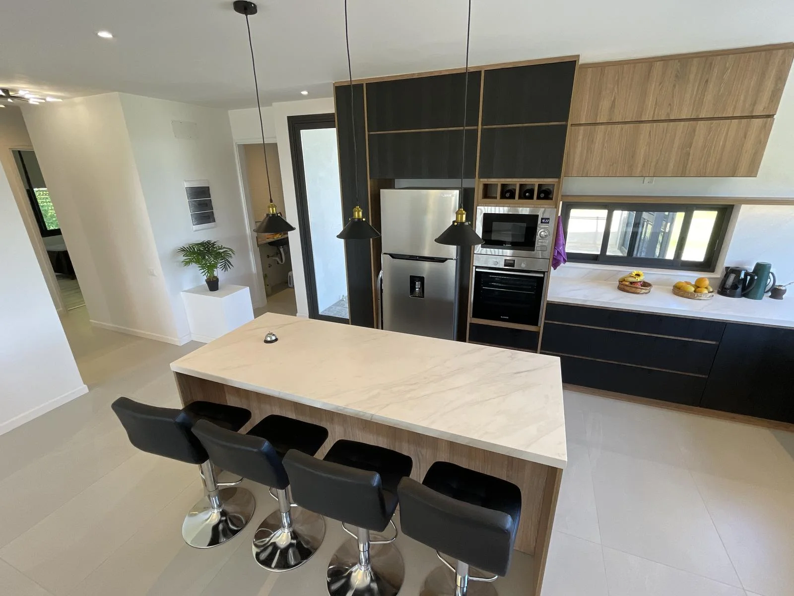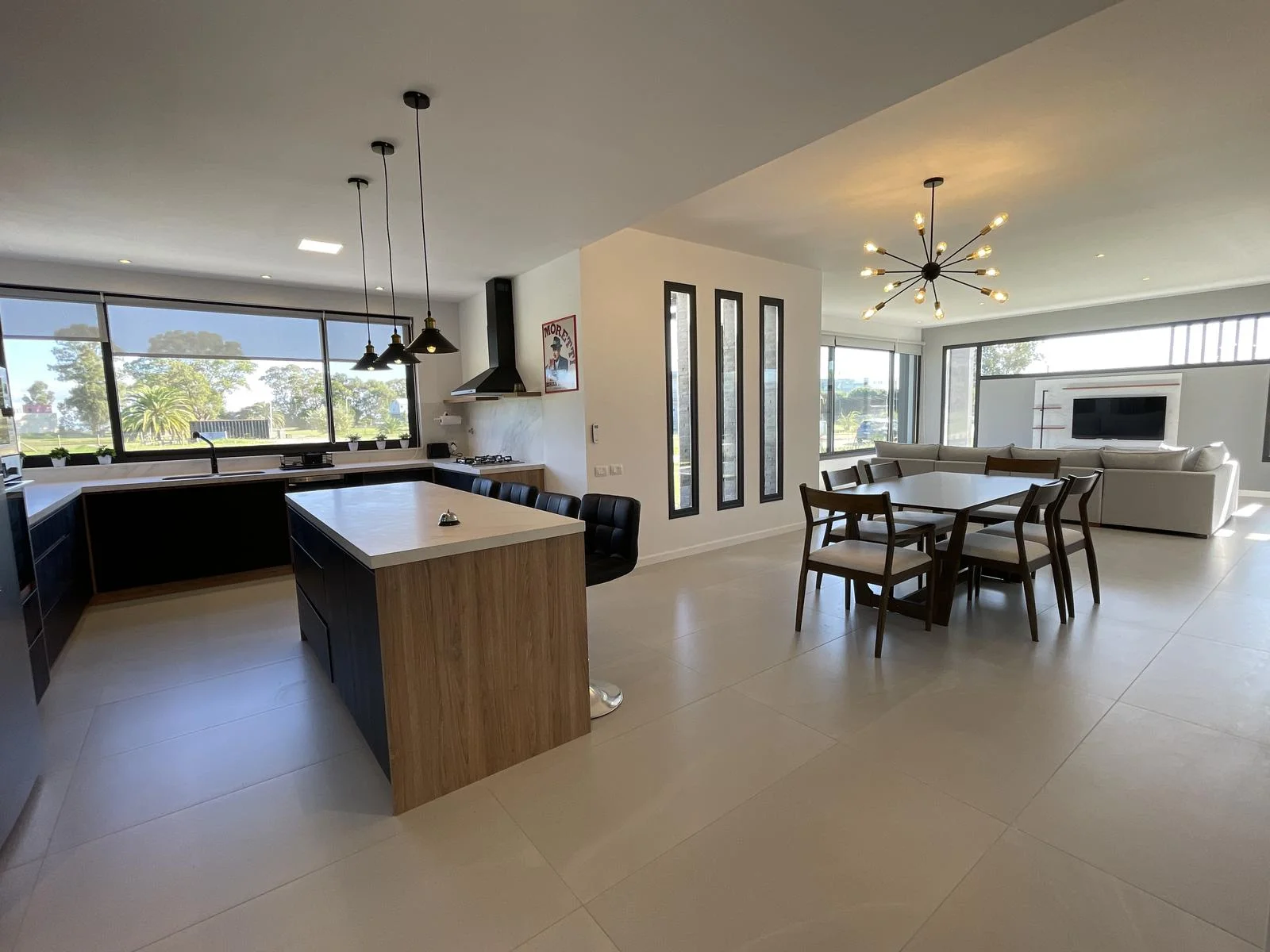 Cocina integrada con mesada de granito, doble pileta, campana extractora de aire de acero inoxidable y muebles con diseño exclusivo y carpintería de alta calidad.