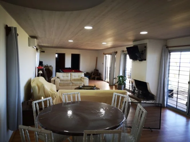 *Comedor, living y sala de juegos integrados* en un espacio de más de 15 metros de largo, con grandes ventanales que conectan con el parrillero y una vista abierta al campo y al mar.